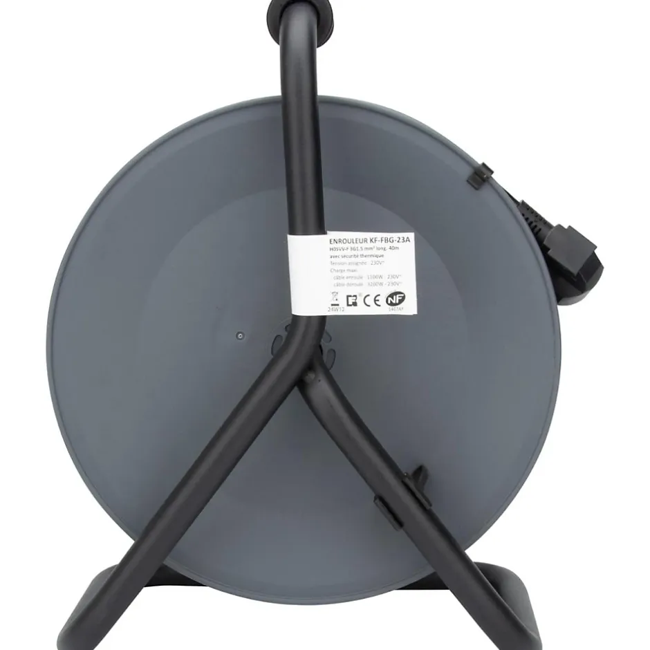 Caractéristiques de l’enrouleur H05VV-F 4 prises 40m 3G1,5 + coupe-circuit + support mural – Zenitech :Modèle : enrouleur 4 prisesCouleur(s) : grisCâblé en H05VV-F 3G1,5mm²Longueur : 40mPuissance max déroulé 3200W et enroulé 1100W sous 230VEnrouleur 4 prisesSécurité thermiqueNorme(s) : NFEnrouleur de bricolage 40m 4 prises 2P+T équipé d’une poignée ergonomique pour plus de confort et d’une peinture protectrice !Le socle est en métal pour une meilleur solidité. De plus, il est équipé d’un coupe-circuit de sécurité thermique. L’enrouleur 4 prises de couleur grise est conçu pour répondre à vos besoins électriques avec plusieurs longueurs de câble disponibles : 15, 25, 40 ou 50 mètres, offrant une flexibilité d’utilisation sur de grandes distances.Avec une puissance maximale de 3200W déroulé et 1100W enroulé sous 230V, il permet d’alimenter en toute sécurité des équipements variés. Les 4 prises 2P+T sont protégées par un système de sécurité thermique contre les surcharges et surchauffes.Conforme aux normes NF, cet enrouleur garantit une utilisation fiable et sécurisée, que ce soit pour des travaux domestiques ou professionnels.Support mural pour enrouleur de jardin entraxe 80mm – Zenitech :Modèle : support mural pour enrouleur de jardinCouleur(s) : noirFixation : muraleEntraxe 80mmDouble système de verrouillage centralCoupe circuit thermique 16ADesign ultra compactPoignée et guide câbles pour un enroulement facileSupport mural pour enrouleur de jardin de ZenitechIl s’installe facilement en trois étapes. Il vous suffit de fixer le support au mur, de placer l’enrouleur dans le supp…