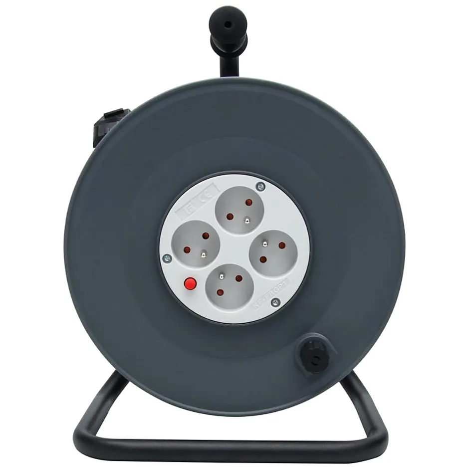 Enrouleur 4 prises. Couleur(s) : gris. Câblé en H05VV-F 3G1,5mm². Plusieurs longueurs : 15, 25, 40 ou 50m. Puissance max déroulé 3200W et enroulé 1100W sous 230V. Enrouleur 4 prises. Sécurité thermique. Norme(s) : NF. Robuste : Fixation au mur par vis avec un entraxe de 80mm. Double système de verrouillage frontale. Pratique : Stockez votre enrouleur soigneusement sur le mur ou disposez d’un point d’ancrage fixe pour son utilisation.