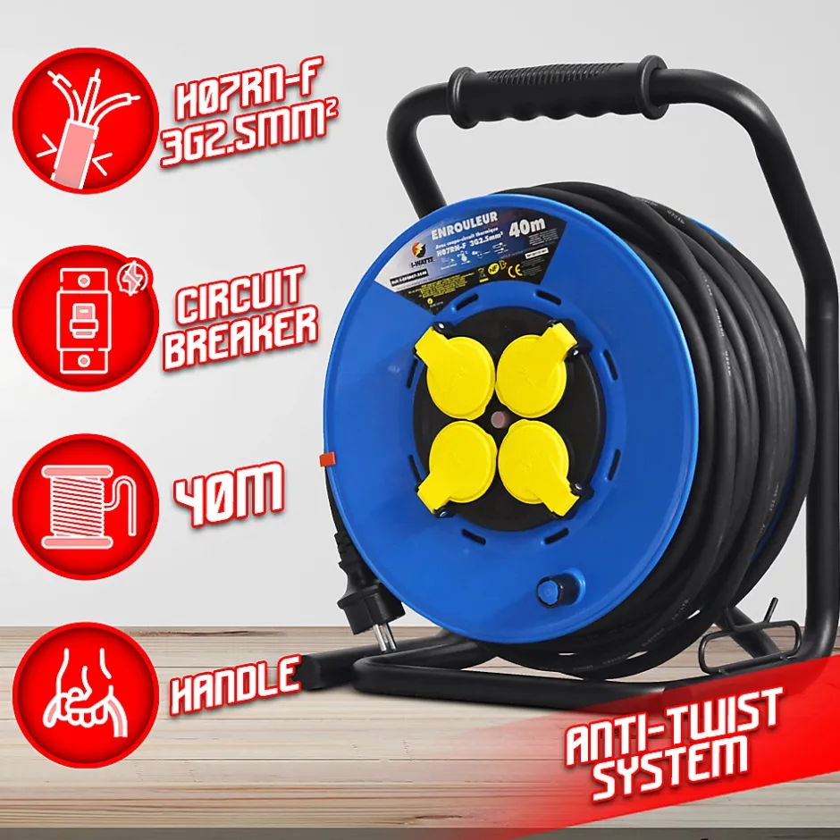 - Système anti-twist: les prises ne tournent pas avec le tambour lors de l’enroulement et du déroulement du câble