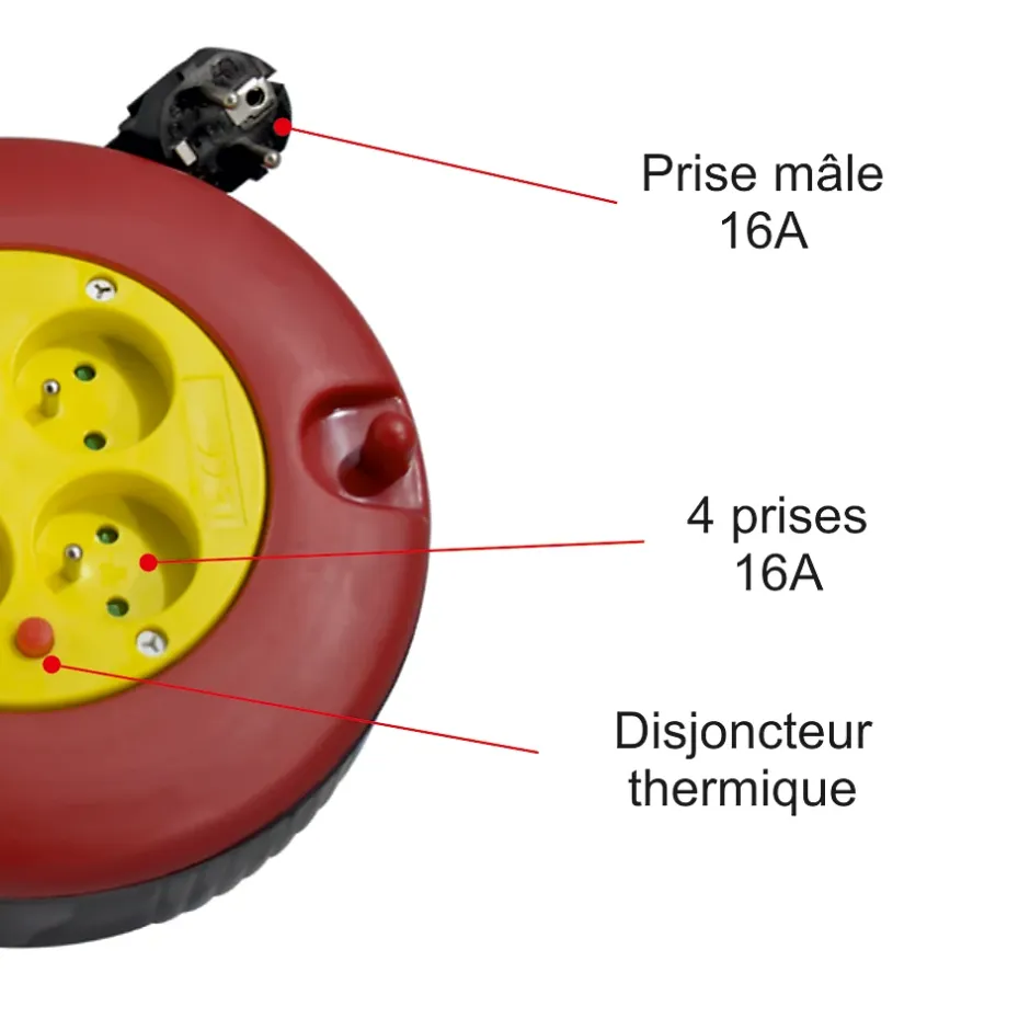 Un enrouleur robuste et sécurisé pour une utilisation polyvalenteCet enrouleur électrique de 5 mètres (câble H05VV-F 3G1.50 mm²) est conçu pour une utilisation pratique et sécurisée en intérieur. Il est équipé de 4 prises 16A, d’un disjoncteur thermique et d’une protection enfant pour garantir une sécurité optimale.Caractéristiques techniquesTension : 220 – 240 VAmpérage : 16 AIndice de protection : IP20Nombre de prises : 4Type de câble : H05VV-F 3G1.50 mm²Longueur du câble : 5 mètresPrésence de terre : OuiProtection enfant : OuiProtection thermique : Disjoncteur intégréPuissance max déroulé : 3200 WPuissance max enroulé : 1100 WNormes : CE, NF, RoHSGarantie : 2 ansUn accessoire indispensable pour alimenter vos équipements électriques en toute sécurité et avec une grande flexibilité.