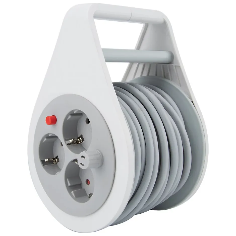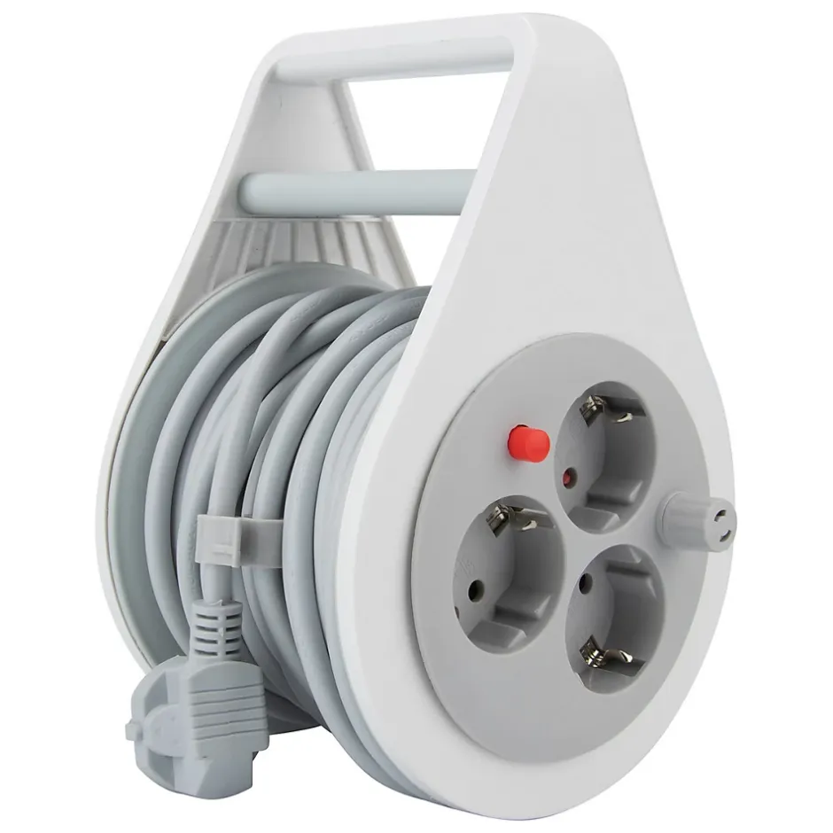 Enrouleur domestique. Couleur(s) : gris. Puissance : 100W max enroulé – 3000W max déroulé. 3 prises 2P+T. Câble H05VV-F 3G1,5mm². Longueur du câble : 7m. Faciles à enrouler et à dérouler. Protection contre la surchauffe. Avec poignée de transport ergonomique