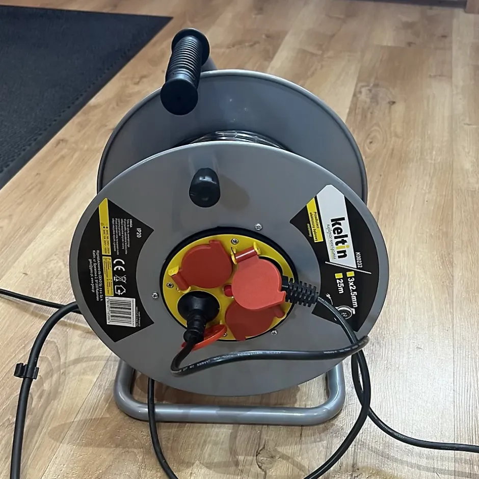 Enrouleur électrique 4 prises 3×2,5 mm. CARACTÉRISTIQUES : L’enrouleur électrique dispose de 4 prises de courant à clapet (prise type F, norme européenne, avec terre), permettant une utilisation même à l’extérieur. La différence entre les prises type E utilisées en France et F (Europe) vient de la manière de connecter la terre. Sur le type E la prise de terre est une broche cylindrique dépassant du socle femelle. Sur le type F, la prise de terre est constituée de deux ergots placés sur les bords intérieurs de la prise femelle. Disponible en 25 ou 50 mètres, la puissance maximale du câble est de 1000 W enroulé, et de 2500 W une fois déroulé. L’enrouleur électrique est doté d’une poignée permettant l’enroulage du câble et d’une poignée de transport antidérapante. CARACTÉRISTIQUES TECHNIQUES : Type de câble : H05VV-F 3G 2,5 mm². Longueur de câble : 25 ou 50 mètres selon le modèle choisi. Type de prises : 4 prises F de 250 V. Puissance maximale : 1000 W enroulé/2500 W déroulé. Protection : IP 20. Intensité : 16 A. DIMENSIONS ET POIDS : Dimensions : L 28 x l 22 x H 36 cm. Poids : 4,7 kg (25 m) ; 7 kg (50 m). À NOTER : pas de livraison en Corse ou sur les îles.