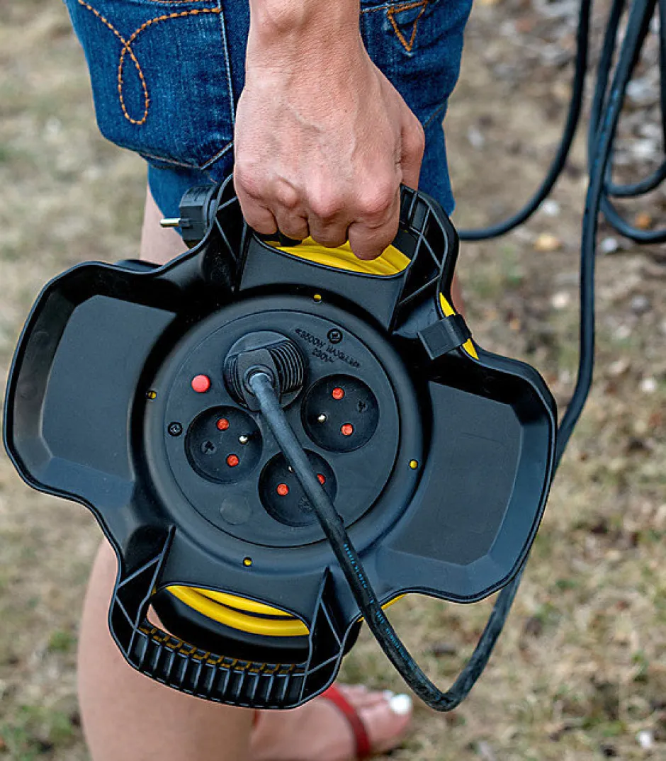 Enrouleur électrique compact XGUM, idéal pour une utilisation temporaire en extérieur. Léger, pratique et robuste, il dispose de deux poignées intégrées pour un transport facile. Câble jaune H05VV-F 3G1,5 de 20 m pour une visibilité optimale, support plastique/caoutchouc renforcé pour résister aux charges lourdes. Équipé de 4 prises 2P+T 16A, d’une fiche 2P+T 16A et d’un disjoncteur thermique pour la protection contre la surchauffe. Puissance maximale : 1 000 W câble non déroulé et 3 500 W câble déroulé.