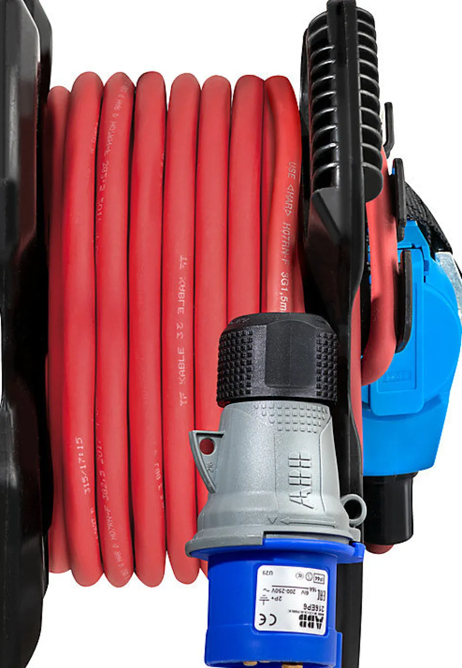 - Enrouleur robuste avec support plastique/caoutchouc et prise-adaptateur CEE P17/standard français.