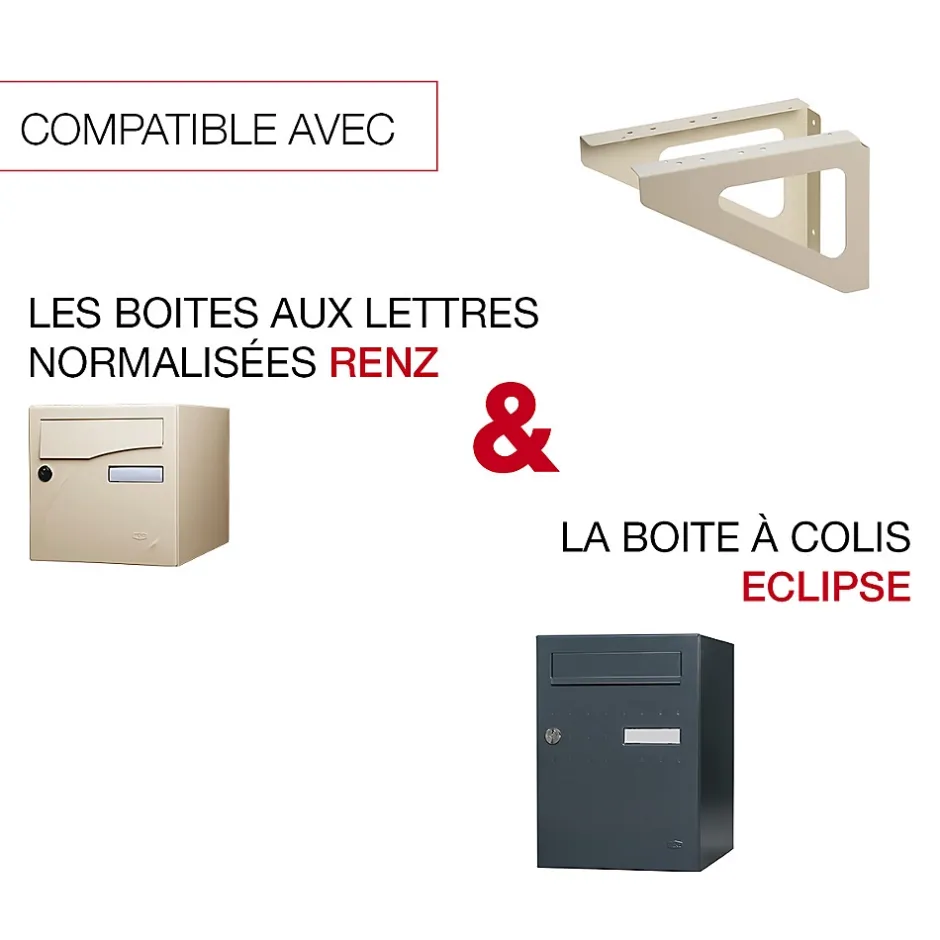 Paire d’équerres murales Renz de 175x250x30mm spécialement adaptée aux boîtes aux lettres Renz. Visserie fournie permettant la pose de la boîte aux lettres sur les équerres pré-percées. Livré avec visserie permettant la pose de la boîte aux lettres sur les équerres contre un mur ou un pilier, en bordure de propriété, à la hauteur recommandée. Coloris assorti à la boite aux lettres. Découpe intérieure pour pouvoir y déposer un journal. Garantie anti-corrosion de 15 ans. Pour une pose murale de votre boite aux lettres, optez pour les équerres de fixation murale qui garantissent une stabilité parfaite à votre boite. Leur découpe intérieure est spécialement conçue pour accueillir votre journal. Pour une parfaite harmonie avec votre boite aux lettres RENZ, ces équerres sont disponibles dans plusieurs coloris. Elles bénéficient d’une garantie de 15 ans anti-corrosion.Photos non contractuelles, se référer au RAL pour le coloris.