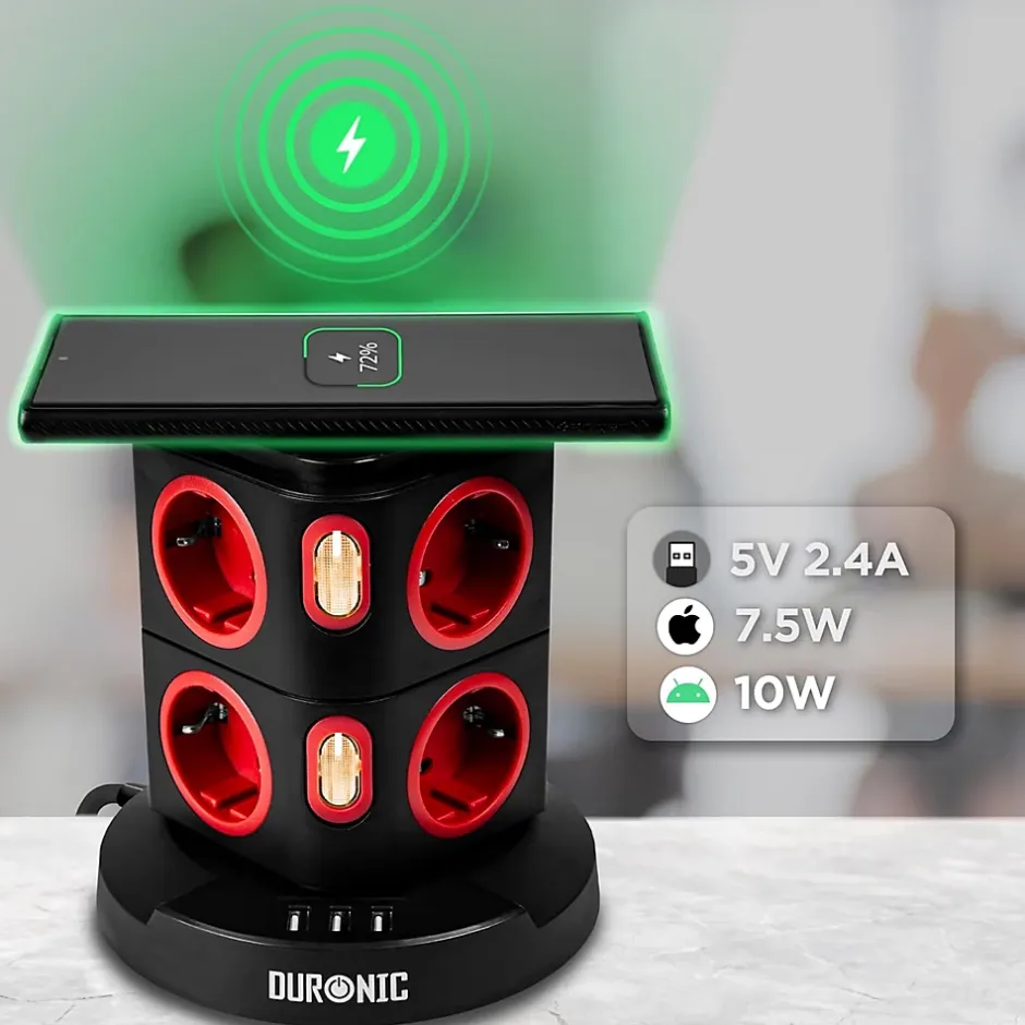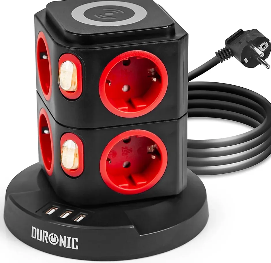 Découvrez la tour multiprise ET8W de Duronic conçue pour répondre à tous vos besoins. Avec 8 prises secteur et 3 ports USB, cette tour multiprise est un véritable outil polyvalent et efficace. Les dimensions compactes de cette tour multiprise sont de 14,5 x 14,5 x 14,5 cm. Le câble de 1,8 m de long permet d’avoir de la rallonge pour brancher vos appareils. Avec une puissance de 3680W, la tour ET8W offre une solution fiable pour charger tous vos appareils.Un port de recharge sans fil est également présent sur le haut de l’appareil de 1,1A, 9V et 10W, ce qui est idéal pour votre smartphone. Les 3 ports USB offrent une sortie de 5V et 2,4A, parfait pour vos petits appareils. Que vous soyez dans la cuisine, le salon ou la chambre à coucher, la tour d’extension ET8W est la solution idéale pour vos besoins en alimentation électrique. Dans la cuisine, vous pouvez alimenter divers appareils tels que les mixeurs, les cafetières, les grille-pains.Près de votre téléviseur et de votre centre de divertissement, cette tour vous permet de brancher des consoles de jeu, du matériel audio, des dispositifs de streaming et d’autres équipements de divertissement. Elle vous offre un accès facile et pratique à toutes vos sources de divertissement préférées.L’ET8W est le compagnon idéal pour vos voyages. Son format compact et sa prise de type C s’adaptent parfaitement à la plupart des prises électriques européennes. En voyage, vous pourrez étendre votre source d’alimentation en toute confiance. La fonction de protection contre les surcharges garantit la sécurité de vos appareils où que vous soyez. Sa forme de cube la rend facile à placer dans n’importe quelle pièce. Sa couleur rouge attrayante en fait un ajout élégant à votre décor intérieur.Que vous viviez dans une maison ancienne avec peu de prises électriques, que vous travailliez dans un atelier, un hôtel ou un bureau, la tour multiprise ET8W de Duronic est la solution qu’il vous faut pour étendre votre s