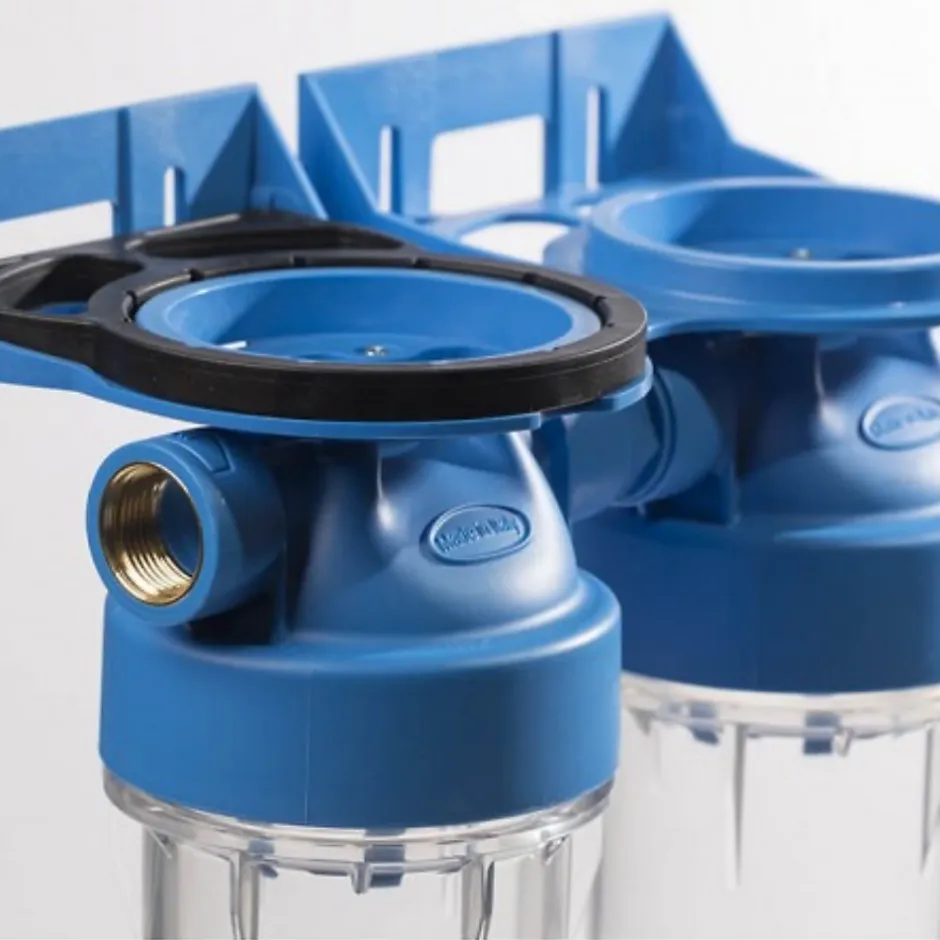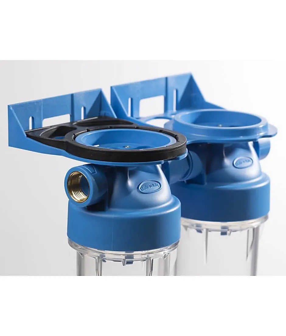 En fonction de la cartouche utilisée, retenez le calcaire, les sédiments, métaux lourds (plomb), nitrate, mauvais goût et odeur de CHLORE, bactéries, herbicides, et autres produits chimiques éventuellement présents dans votre eau. Les cartouches ne sont pas fournies, filtre vendu vide. Ce filtre double est généralement utilisé avec une cartouche bobinée et une cartouche anti-calcaire. Dans ce cas il a une action préventive et curative anti tartre qui protège votre installation contre l’entartrage des canalisations et des robinets. Il filtre les particules en suspension telles que l’argile, la rouille, le sable… Filtre 2 parties livré avec clé et équerre• Tête en polypropylène• Cuve PET transparente• Changement aisé : centreur de cartouche intégré• Bonne étanchéité : events en laiton équipés de joints toriques• Installation facile et solide : inserts en laiton• S’installe sur l’arrivée d’eau générale après le compteur pour traiter toute l’habitation