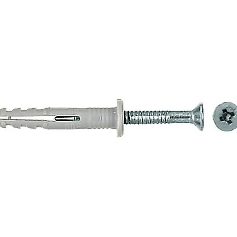 Chevilles à clou N-FZ 6 x 40 mm – lot de 100. Cheville à frapper N-P avec tête bombée en nylon et clou en acier électrozingué, vis pré-montée pour un gain de temps. Convient pour montage traversant, s’expanse dans deux directions pour une ancrage sûr. Butée interne anti-blocage, démontage possible du clou-vis avec tournevis cruciforme, montage rapide au marteau pour des installations en série.