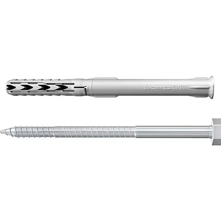 Cheville à tige longue Fischer SXR-SS 10 x 120, lot de 4 avec 4 vis à tête hexagonale 7,0 x 127 mm. Cheville nylon haute qualité, expansion dans matériaux pleins et ancrage en cavité dans matériaux ajourés. Profondeur d’ancrage réduite (50 mm) pour des fixations économiques, idéale pour systèmes non porteurs et fixations multiples. Convient pour béton, brique perforée, brique silico-calcaire creuse ou pleine, pierre naturelle, blocs isolants et mur en béton cellulaire. Vis en acier étamé par galvanisation, diamètre extérieur 10 mm, perceuse recommandée 10 mm. Évaluation ETA pour béton et maçonnerie, résistance à la corrosion, garantie fabricant 2 ans.