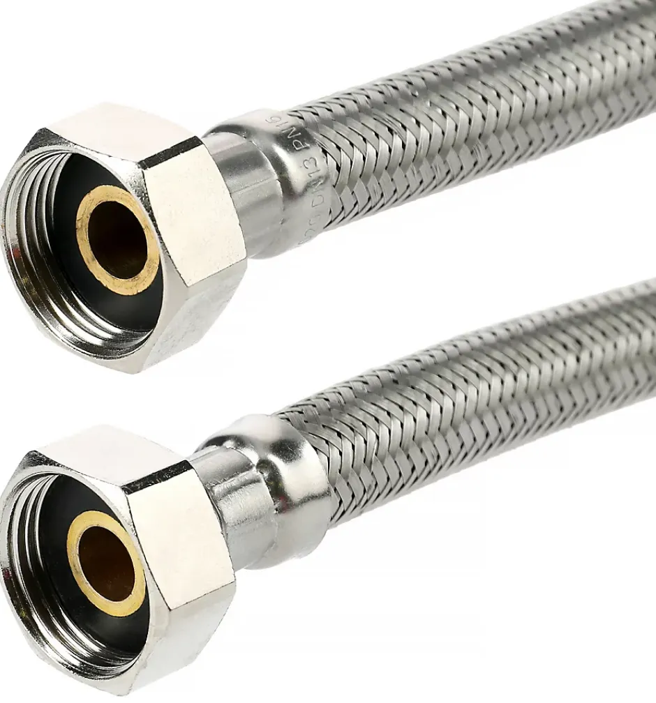 Flexible sanitaire double femelle.Caractéristiques techniques: Installation sur équipement sanitaire, robinet, chauffe-eau, lavabo et bidet (pour raccordements de 12/17 à 15/21) ou sur chauffe-eau, réservoir d’eau, ventilo-convecteur, climatisation et panneau solaire (pour raccordement 20/27)Température d’utilisation max: de 70 à 90°C selon modèlePression max: de 10 à 16 bar selon modèleDiamètre intérieur: de 8 à 13 mm selon modèleDiamètre extérieur: de 12 à 18 mm selon modèleFlexible intérieur en caoutchouc (EPDM)Tressage et embout métallique en acier inoxydable AISI 304Raccords en laitonRondelle en EPDM intégrée (sauf pour raccordement 20/27)Conformes aux normes ACSLes flexibles sanitaires GARIS sont garantis pendant 3 ans.