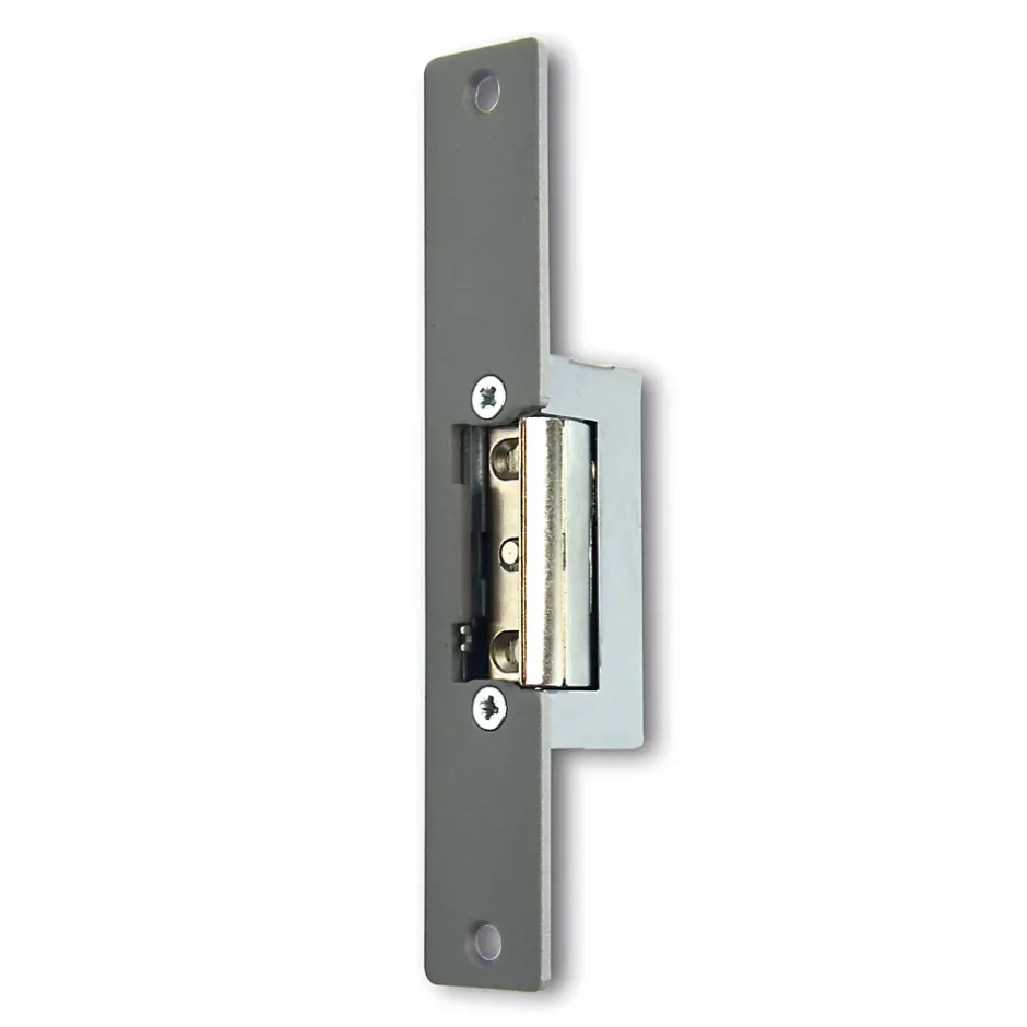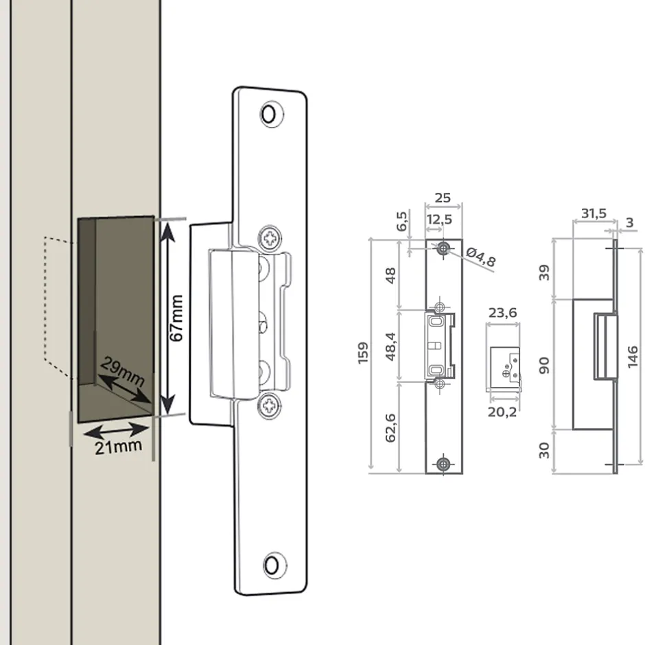 Gâche électrique Extel WECA 90201.3 à encastrer, sans passage de serrure, compatible avec toutes les serrures encastrées, à faible consommation énergétique, avec serrure réversible et mémoire d’appel pour un fonctionnement fiable et sécurisé. Compacte et robuste, idéale pour sécuriser portes et portillons de différentes configurations.