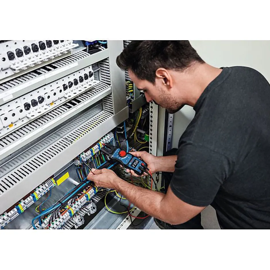 Multimètre fourche True RMS Bosch GFM 1000-15 Professional, conçu pour les professionnels – mesure non invasive du courant alternatif jusqu’à 200 A CA avec mâchoire ouverte, affichage LCD à couleurs inversées et fonction de maintien des mesures. Robuste et adapté aux chantiers avec index IP54, conception compacte pour les espaces exigus, compatibilité avec la suspension magnétique MH 1 Professional pour une utilisation mains libres. Équipé d’un détecteur de tension sans contact (NCV), d’une lampe torche, de bandes de mesure en silicone durables et d’une ergonomie réduisant la fatigue. Protection utilisateur selon CAT IV 600 V et CAT III 1000 V, compatible batterie Lithium-Ion pour une autonomie prolongée.