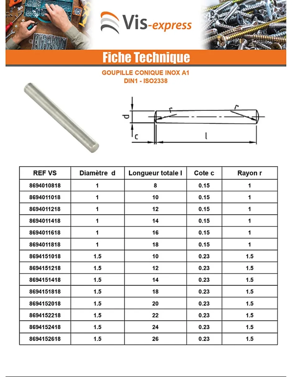 Goupille Conique 3X16 Inox A1Diametre = 3, Longueur = 16, Matiere = A1, Norme = VS-DIN1 – ISO 2339, Famille De Produits = GoupilleAutre références : 3617500496911 3663072402447