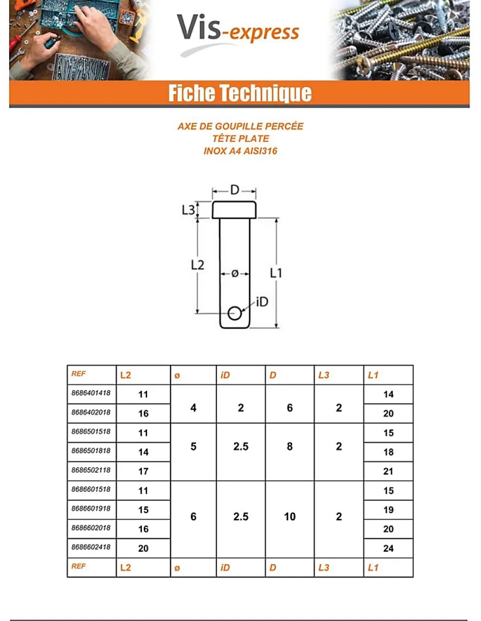 Goupille Tête plate 10X64 Percée 3 Inox A4Diametre = 10, Longueur = 64, Famille Sous Produits = Tete plate, Matiere = A4, Famille De Produits = GoupilleGuide dimensionnel (en mm) Diamètre 4 5 6 8 9.5 10 11 12 14 DIAMETRE DU TROU 2 2.5 2.5 3 3 3 3 3 4 Autre références : 8279410 64 3663072553910
