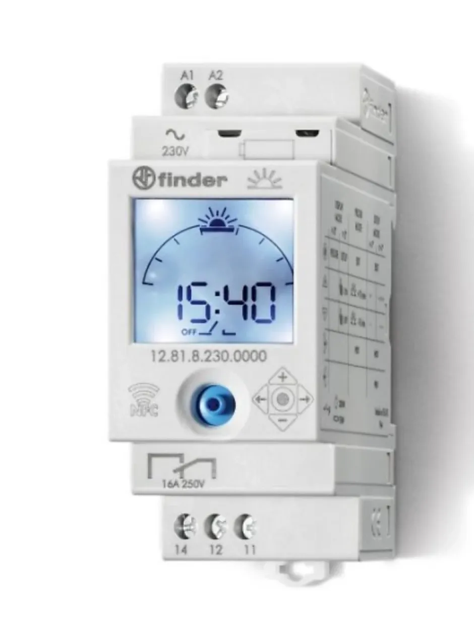 L’horloge astronomique Finder journalière peut être programmée de façon “classique” par le joystick ou “Smart” par smartphone avec la technologie NFCLe programme Astro permet le calcul par l’appareil, de l’heure du lever et du coucher de soleil à partir de la date, de l’heure et des coordonnées de localisation introduites.Le fonctionnement nocturne : horaires d’éclairage/d’extinction programmables.Les coordonnées de localisation sont définies simplement par les 2 premiers chiffres du code postal pour la plupart des pays européens.La fonction correction programmation permet le décalage du temps de commutation prévu par la fonction astro (jusqu’à + ou – 90 mn, par pas de 10 mn).Voici ces principales caractéristiques :Changement d’heure été/hiver Européen1 contact inverseur 16 AEcran LCD pour visualisation, configuration et programmationVerrouillage par code PIN à 4 chiffresEcran rétro-éclairéPile interne pour réglage et programmation sans alimentation, remplacement facile en façade de l’appareilIsolement de protection entre alimentation et contactLargeur 35 mmContacts sans Cadmium