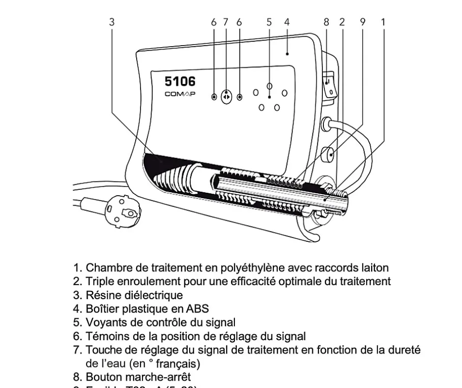 Il élimine le tartre existant en le désagrégeant progressivement,- il empêche la formation de dépôt de tartre,- il permet aux générateurs d’eau chaude de conserver leur rendement et leur efficacité,- l’eau ne subit aucun traitement chimique et conserve sa minéralité, elle reste potable, elle conserve sa richesse d’origine en carbonates de calcium et en sels minéraux nécessaires à la santé,- il est sans entretien et n’utilise aucun consommable,- installation facile sur canalisation neuve ou existante. Domaines d’application : – installation domestique eau froide,- boucle eau chaude sanitaire. Données techniques : – Pression de service : de 0 à 4 bars.- Débit max : 3000 l/h.- Fusible : 63 mA T.- Puissance électrique : 10 VA max.- Étanchéité : IP 31.- Température eau : 5 à 70 °C.- Raccordement sur réseau électrique monophasé 230 V~ 50/60 Hz + terre.- Protection pour les surtensions secteur.- Sélecteur de puissance de traitement antitartre : position 1 pour eau de TH position 2 pour eau de TH ge; 25 °F.- Dureté de l’eau à traiter jusqu’à 60 °F ou 34 °DH. Garantie 2 ans : contre vices de fabrication, hors pièces d’usure.