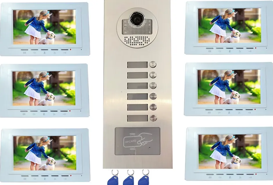 Visiophone collectif pour immeuble avec platine de rue 6 boutons et 6 écrans couleurs 7 pouces avec lecteur de badge sur la platine de rue et fonction enregisteur de visiteur pour chaque écran sur carte SD