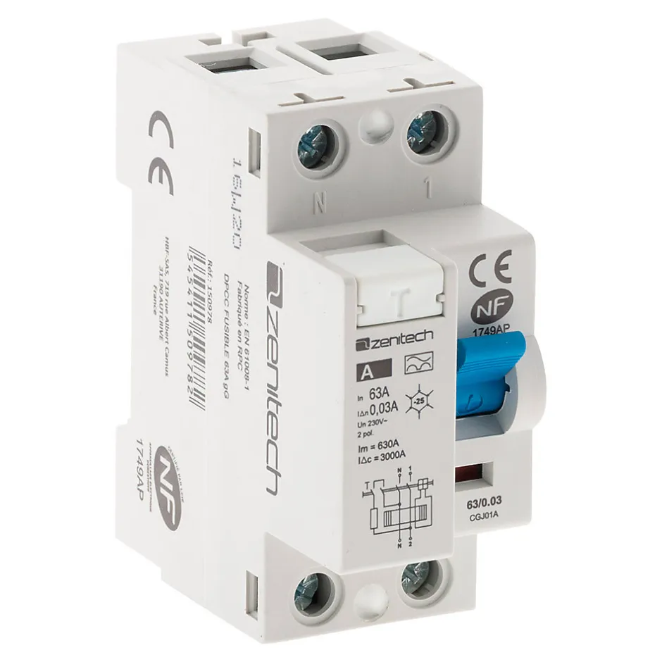 Caractéristiques de l’interrupteur différentiel 40/2 30mA Type A NF – Zenitech :Modèle : interrupteur différentielFixation à vis 30mA type A d’une puissance de 40AIl peut être installé sur votre tableau électrique par serrage classique à visLe courant résiduel assigné est de 30mALivré avec un porte étiquetteConforme aux normes NF EN 61008-1 et NF EN 61008-2-1.Certifié NF et CEL’interrupteur différentiel 40A type A assure une protection efficace contre les fuites de courant sur votre installation électriqueSon courant résiduel assigné de 30mA permet de sécuriser les équipements et les personnes contre les risques d’électrocution. Il se fixe facilement sur un tableau électrique grâce à son serrage classique à vis