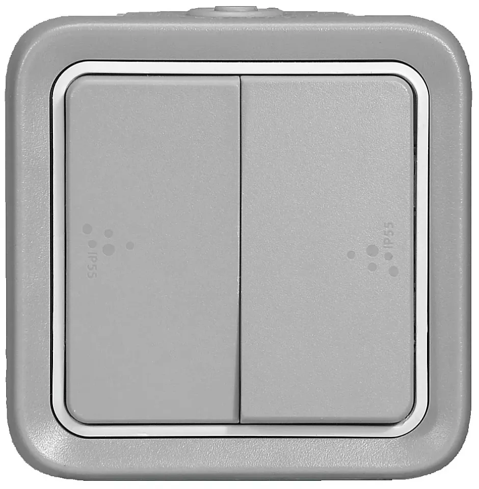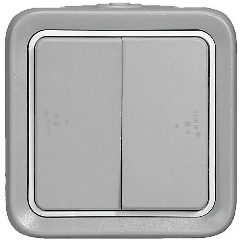 Interrupteur double Legrand Plexo saillie étanche IP55 (IK07) modèle 069715 — robuste pour usage intérieur et extérieur, supporte 10AX 250V et livré complet avec 2 embouts et bornes automatiques pour une installation rapide et sans outil. Conforme NF EN 60669-1 / IEC 60669-1.