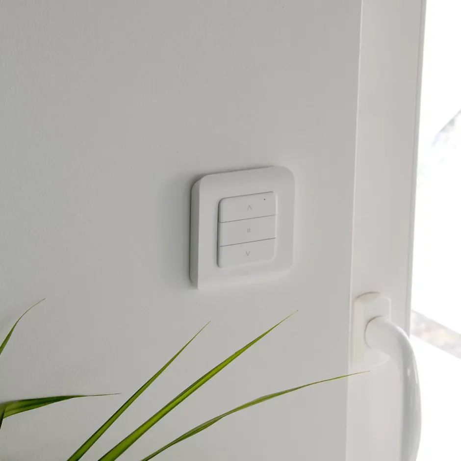 Avantages Cet interrupteur sans fil vous séduira par sa facilité d’installation et d’utilisation, permettant de contrôler votre volet localement. Placez facilement l’ interrupteur sans fil où vous le souhaitez et reliez-le à votre modules DiO. Gérez tous vos modules automatiquement, individuellement ou de manière centralisée. Caractéristiques Fonctions : Ouverture / Fermeture / Arrêt Nombre de canaux : 1 100% compatible avec tous les récepteurs DiO et DiO Connect Protocole radio : DiO 1.0 (433 MHz) Portée : 50 m (en libre champ) Installation Connectez simplement votre volet à distance en l’associant à votre module volet DiO souhaité. Appuyez sur le bouton « Monté » de votre interrupteur pour le connecter au module.