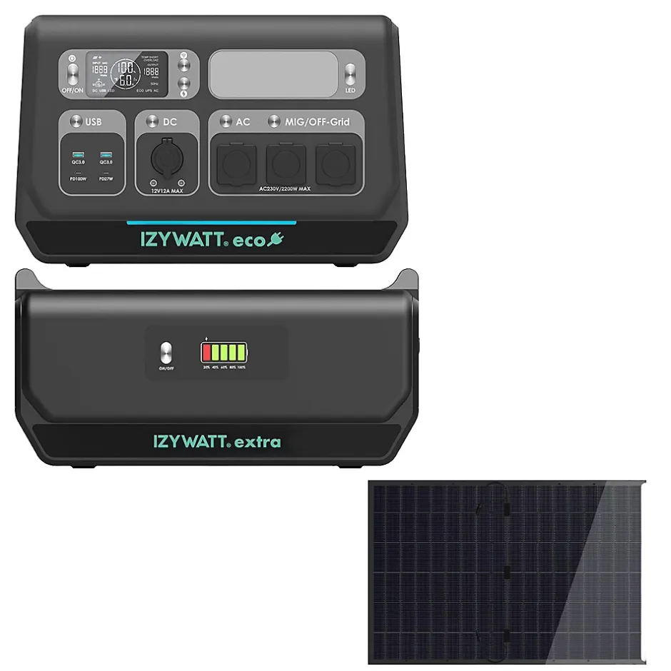 IZYWATT.eco + panneau solaire 440W cadre + batterie additionnelle IZYWATT.extra – 2048 WhLa station d’énergie portable ultimeInjection réseau, autonomie, puissance et mobilité pour votre maison, vos activités outdoor ou vos situations d’urgence. Compacte, fiable et prête à l’emploi, IZYWATT.eco vous accompagne partout ! IZYWATT.eco : la station d’énergie qui s’adapte à tous vos besoins ! Découvrez IZYWATT.eco, la station d’énergie portable qui combine puissance, autonomie et polyvalence. Conçue pour la maison, les activités outdoor ou les situations d’urgence, elle offre une recharge rapide, une compatibilité solaire et une connectivité complète.Avec sa technologie LFP durable et sa capacité évolutive, IZYWATT.eco est la solution idéale pour profiter d’une énergie fiable, où que vous soyez : <div style= »border-left: 6px s…