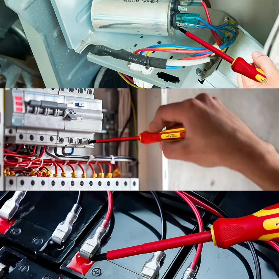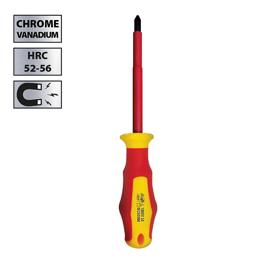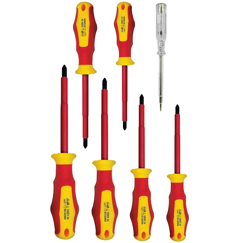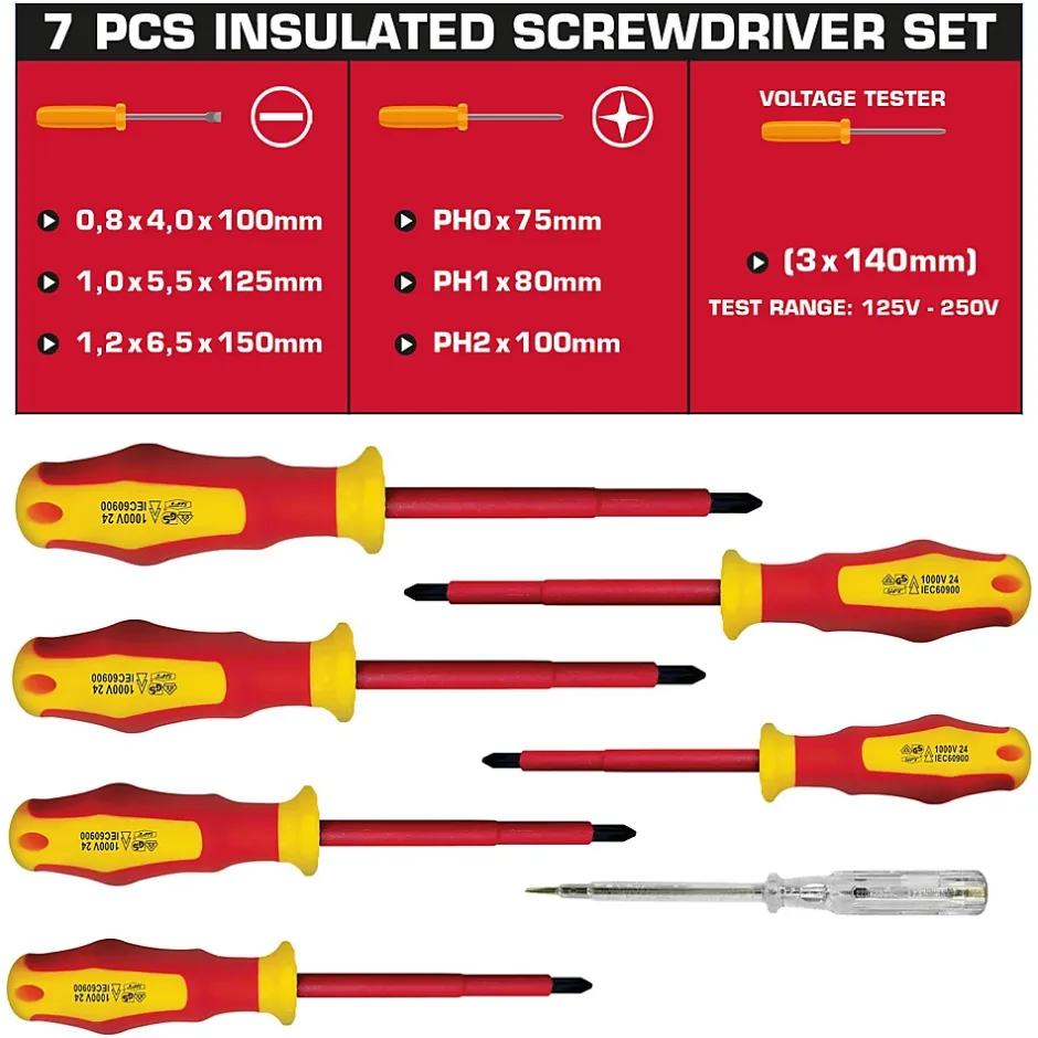 JEU DE TOURNEVIS D’ÉLECTRICIEN 7 pièces. Tournevis pour électriciens professionnels avec poignée ergonomique. Avec pointes magnétiques. CERTIFICATION VDE – Tournevis d’électricien isolés jusqu’à 1 000 Volts. Certifié VDE. Avec testeur de tension de 140 mm (plage de test 125 V – 250 V). Matériaux : acier au chrome vanadium : plus de dureté. POIGNÉE ERGONOMIQUE – Tournevis caoutchoutés avec poignée ergonomique et sûre avec protection contre le glissement du pouce. TYPE DE TOURNEVIS ISOLÉS : PH0 x 75 mm ; PH1 x 80 mm ; PH2 x 100 mm ; SL4.0 100 mm ; Type : SL 5,5 125 mm ; Type : SL 6,5 150 mm. Avec testeur de tension de 140 mm (plage de test 125 V – 250 V) ; Matériaux : acier au chrome vanadium. GAMME COMPLÈTE de Tournevis pour les travaux électriques à domicile et en milieu professionnel.