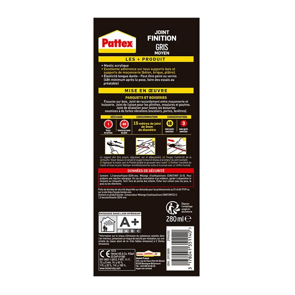 Pattex Mastic Joint de Finition parquets & boiseries est un mastic acrylique idéal pour calfeutrer des fissures sur bois, pour réaliser des joints de raccordement entre maçonnerie et huisserie, des joints de liaison pour les plinthes, moulures, poutres ou encore pour la réalisation de joints de dilatation pour les boiseries soumises à de fortes vibrations, telles que les portes, les fenêtres, les escaliers, etc. Ce mastic à base de résines acryliques peut être posé sur tout support en bois ou de maçonnerie : bois, béton, plâtre, brique, fibre-ciment, etc. Peut être peint ou verni après séchage.