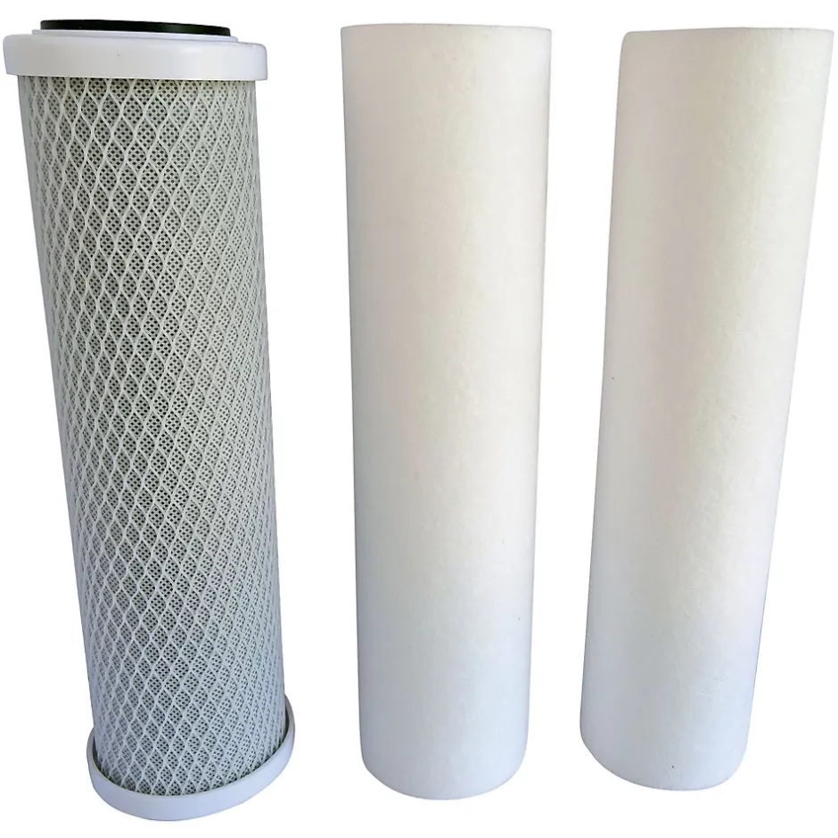 Ce kit de recharges pour osmoseur est composé de 2 cartouches extrudées anti-impuretés (de filtres 20µ et 5µ), et d’une cartouche de filtre à charbon actif de qualité alimentaire, anti-goût et anti-odeurs, destinées à purifier l’eau de consommation de la maison . Il filtre les sédiments, limon et particules avant leur passage sur le module d’osmose et permet la rétention des minéraux, pesticides et bactéries.