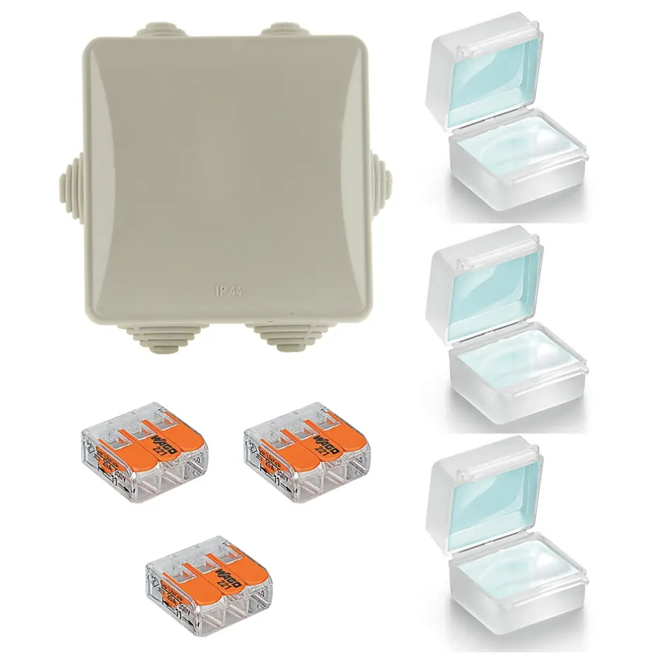 Kit de connexion étanche. 3 bornes WAGO 221 3 entrées. Boite de dérivation étanche. Dimensions de la boîte : 80 x 80 x 40 mm. Indice de protection : IP44. 3 gel box Connex S. Dimensions : 38 x 30 x 26 mm. Indice de protection : IPX8