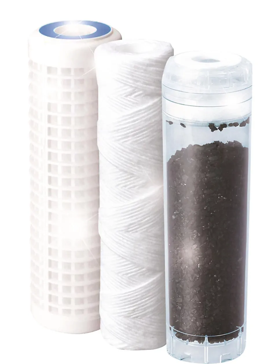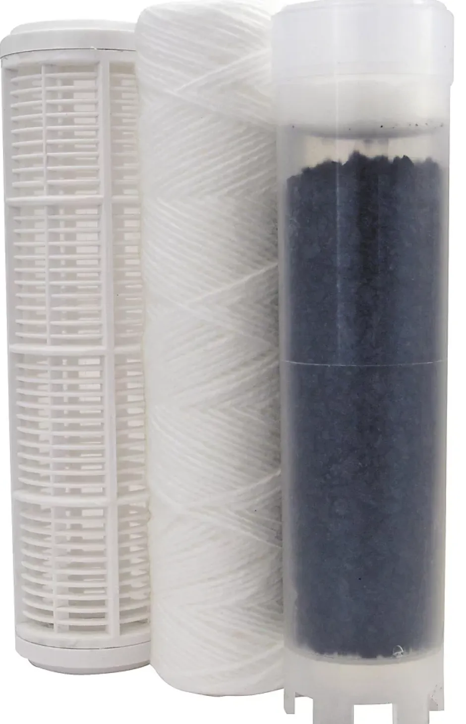 - Composition : 2 cartouches anti-impuretés (1 lavable de 50µ et 1 bobinée de 20µ) + 1 cartouche de charbon actif