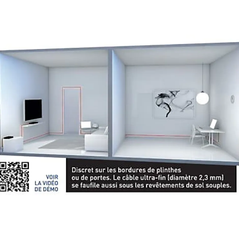 Discret sur les bordures de plinthes ou de portes, le câble ultra fins se faufile aussi sous les revêtements de sol souples. Le câble ultra fin de 20 mètres permet de connecter en toute discrétion un démodulateur TV ou un ordinateur à une box internet