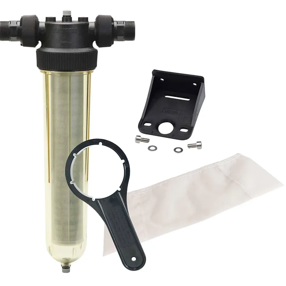 Kit complet filtre anti impuretés Cintropur NW32 – avec équerre de fixation et tamis réutilisable 80 µmLe kit complet filtre NW32 Cintropur est conçu pour le prétraitement de l’eau claire (eau de réseau, eau de pluie, forage…). Il élimine les particules solides : sable, rouille, boues, etc. Ce modèle intègre une hélice centrifuge qui permet d’utiliser la totalité de la surface de filtration du tamis et précipiter les sédiments dans le fond de la cuve.Applications du kit filtre cintropur :Filtration d’eau potable : Le filtre est utilisé pour purifier l’eau potable en éliminant les particules telles que le sable, la boue, la rouille, les algues et autres impuretés présentes dans l’eau de distributionPré-filtration : Il sert de pré-filtre pour d’autres systèmes de traitement de l’eau comme les adoucisseurs, les filtres à charbon actif, les osmoseurs…Filtration agricole : Sert de filtre pour les eaux d’arrosage ou d’abreuvage pour les animauxNotre kit filtre à sédiments comprend les éléments suivants :Filtre anti sédiments 80 micronsEquerre / Fixation murale Tamis lavable cintropur 80 micronsCaractéristiques du kit filtre a eau domestique cintropur :Type de produit : Filtre simpleMatériaux : Polyéthylène / SAN / ABS / PolyesterCouleur : NoirTempérature max : 50°CPression de fonctionnement : 10 barsPression maximale : 16 barsSeuil de filtration : 80 µmLavable : OuiRaccordement entrée / sortie : 1″1/4 – 33/42Installation : idéalement à l’entrée de l’installationDébit nominal : 6,5 m3/hSurface de filtration : 840 cm²Manchon de filtration : LavableHauteur : 581 mmLongueur : 269 mmProfondeur : 130 mmGarantie : 2 ans