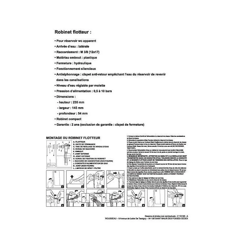 Mécanisme pour réservoir wc apparent – Commande de chasse : bouton poussoir – Ajustable en hauteur – Robinet flotteur pour réservoir WC apparent et encastré – Compact – Raccordement : M 3/8 (12×17) – Fermeture hydraulique – Silencieux – Anti-siphonage – Niveau d’eau réglable par molette – Pression d’alimentation : 0,5 a 10 bars.