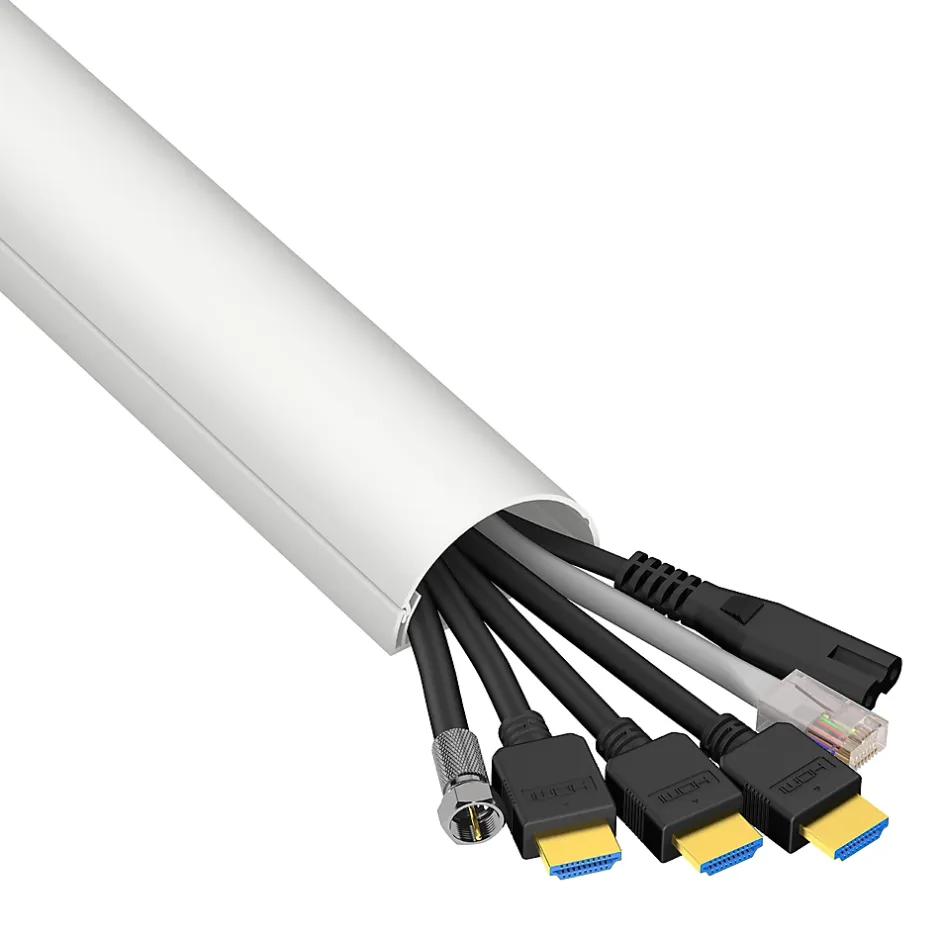- Profil semi-circulaire. S’intègre parfaitement au-dessus des plinthes et dissimule les passages de câbles. Livré avec un film de protection: pas de poussière ou de rayures