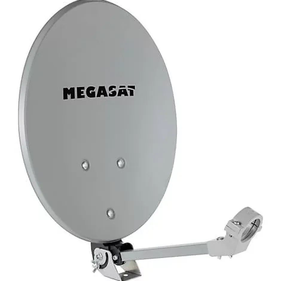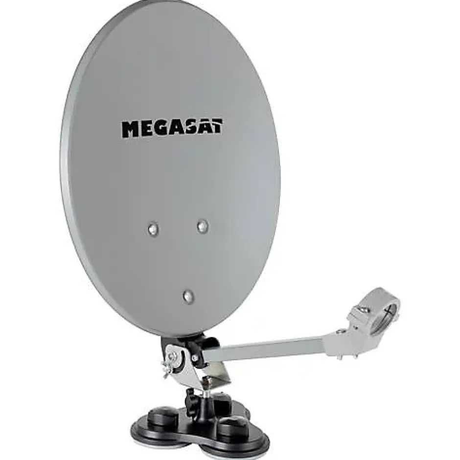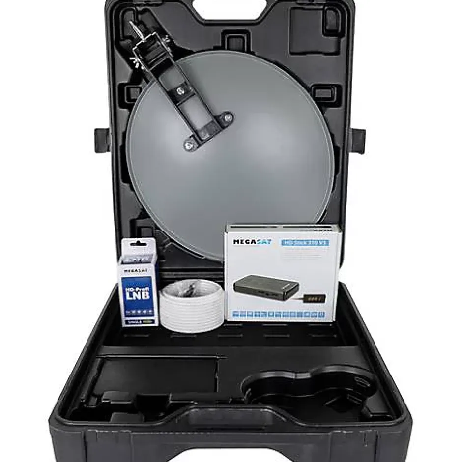 Système satellite portable MegaSat prêt à l’emploi : antenne 35 cm, récepteur HD, faible consommation, port USB, 5 000 mémoires et accessoires de fixation pour camping et voyage.