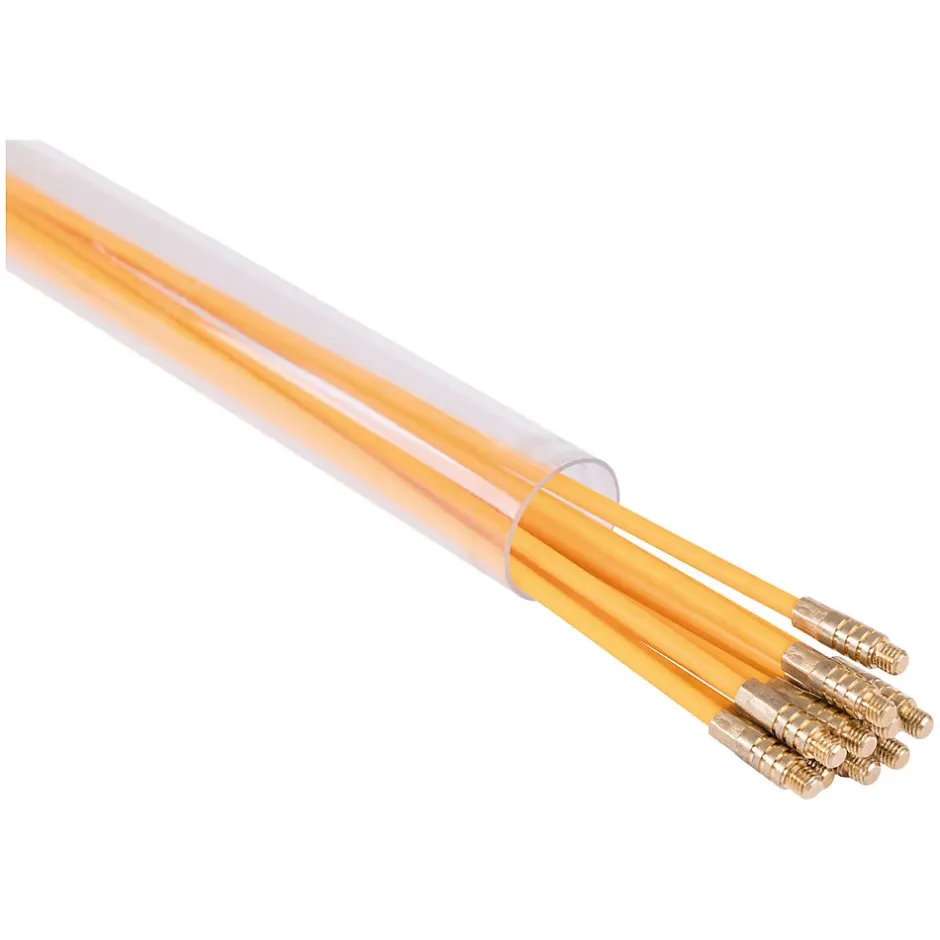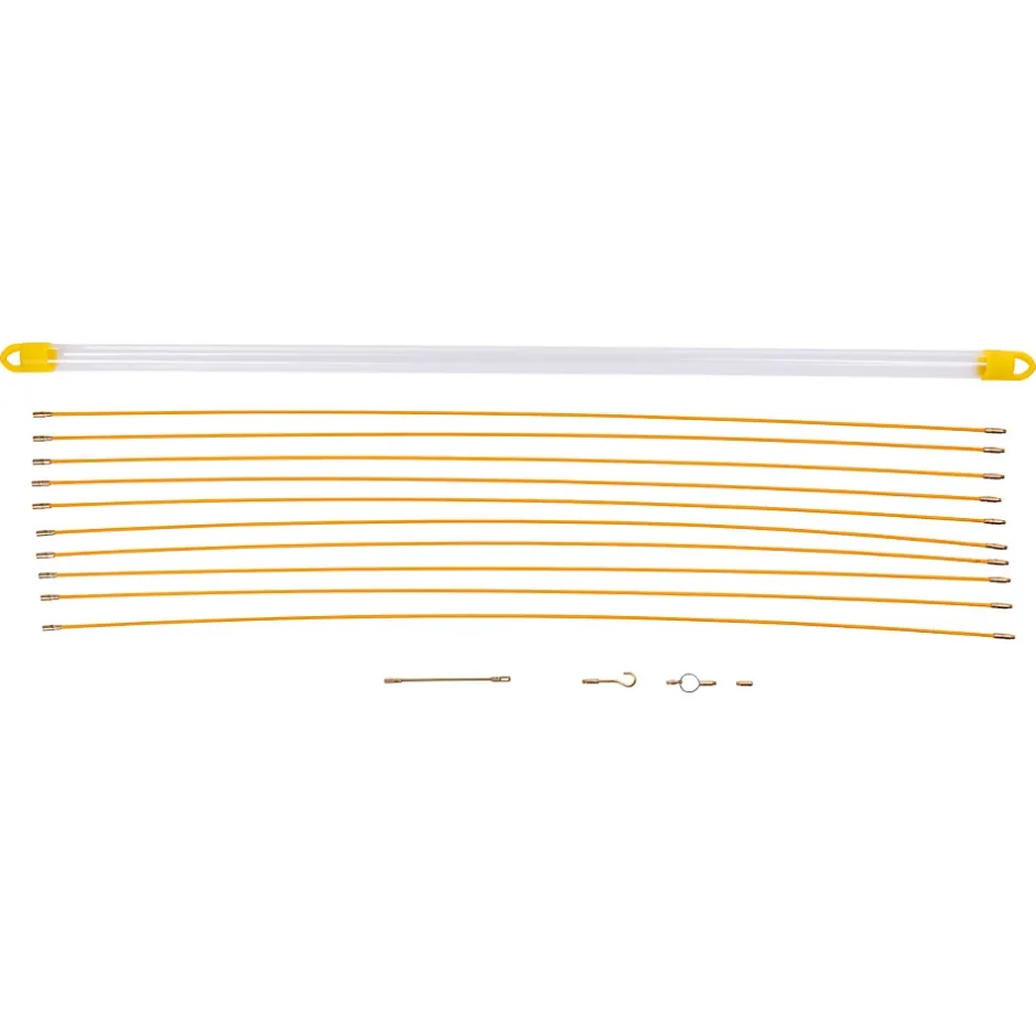 Kit de baguettes tire-fils. Diamètre : Ø3mm. Longueur des baguettes : 1m. Matériau : fibre de verre. Contenu : 10 baguettes, 1 tige flexible 135mm, 1 crochet, 1 tête plate magnétique, 1 tête bombée, 1 mini œil avec bague
