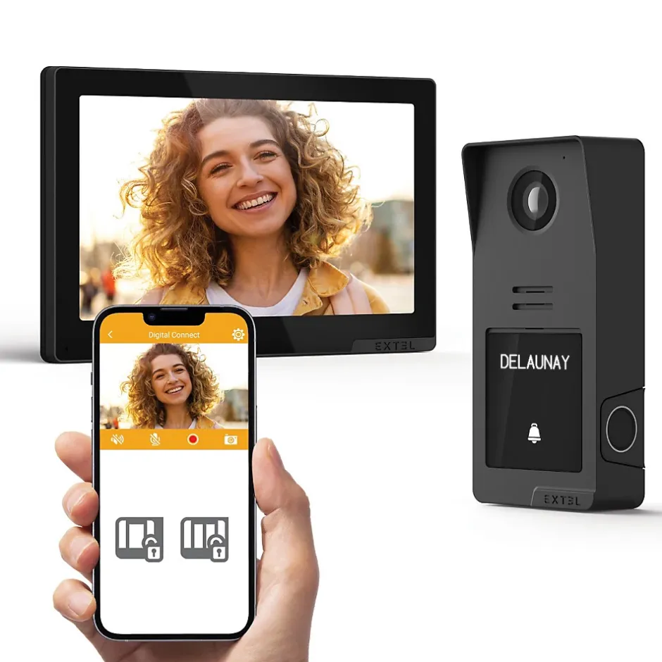 Contenu du kitLe kit se compose de :1 visiophone Digital Connect (réf. 720335)1 moniteur couleur 7″ avec écran tactile et connexion wifi1 platine de rue1 support mural pour moniteurLa visserie nécessaire au montage1 coque graphite pour platine de rue (réf. 720340) Simplifiez votre arrivée avec le lecteur d’empreintes digitalesNe perdez plus de temps à chercher votre clé dans votre sac ou votre poche : utilisez votre empreinte digitale !Grâce à sa technologie biométrique, la platine de rue vous permet de poser votre doigt sur le lecteur d’empreintes pour rentrer chez vous.Si vous posez rapidement votre doigt vous ouvrez le portillon, un appui prolongé et vous ouvrez le portail.Bénéficiez de 3 autres procédés pour accéder à votre logementVous pouvez aussi gérer votre entrée de 3 autres manières : par QR temporaire, via l’application ou depuis votre moniteur. Avec le moniteur, vous pouvez dialoguer, ouvrir ou fermer la gâche électrique ou le portail et profiter de Door Check.Depuis l’application Extel Connect vous bénéficiez des mêmes fonctionnalités que le moniteur et recevez une notification en temps réel. Générez un QR code temporaire qui actionne le portillon ou le portail pour vos visiteurs occasionnels.Une installation simplifiéeProfitez d’une installation simple et rapide en gardant les mains libres pour le câblage qui se fait sur 2 fils avec une distance de 100 mètres entre la platine de rue et le moniteur.Dans un premier temps, fi