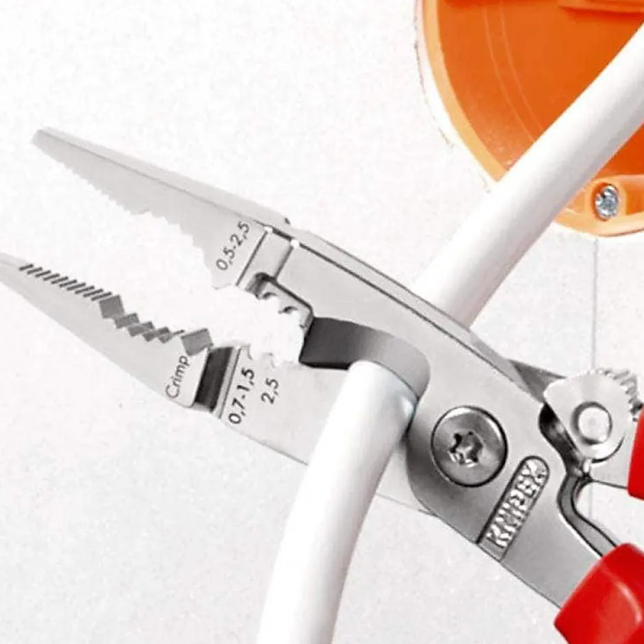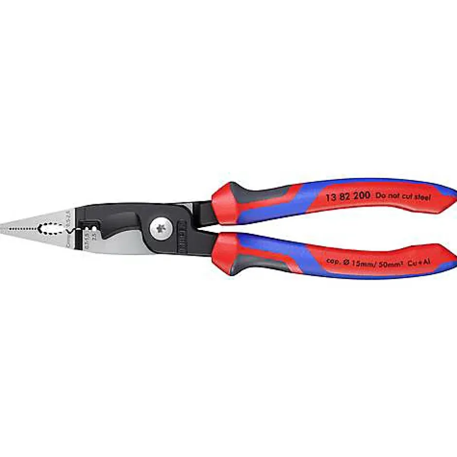 Pince multifonction Knipex 13 82 200 longueur 200 mm, poids 280 g. Conçue pour les installations électriques, elle combine six fonctions : saisie de matériaux plats et ronds, torsion, ébavurage, coupe de câbles, dénudage et sertissage. Dénudage possible jusqu’à 50 mm² (0 AWG), trous de dénudage pour conducteurs 0,7–1,5 mm² et 2,5 mm², et matrice de sertissage pour cosses 0,5–2,5 mm². Coupe-câbles à tranchants de précision, adaptés aux câbles Cu et Al jusqu’à 5 x 2,5 mm² ou 15 mm de diamètre. Becs à bout lisse pour préhension sans endommager les conducteurs, surface de préhension profilée et zone serre-tube pour formes plates et rondes, bord extérieur pour rogner et ébavurer. Charnière vissée pour un mouvement précis, acier spécial forgé et trempé à l’huile, poignée avec gaine bi-matière. Conditionnement : 1 pièce, garantie fabricant 2 ans.