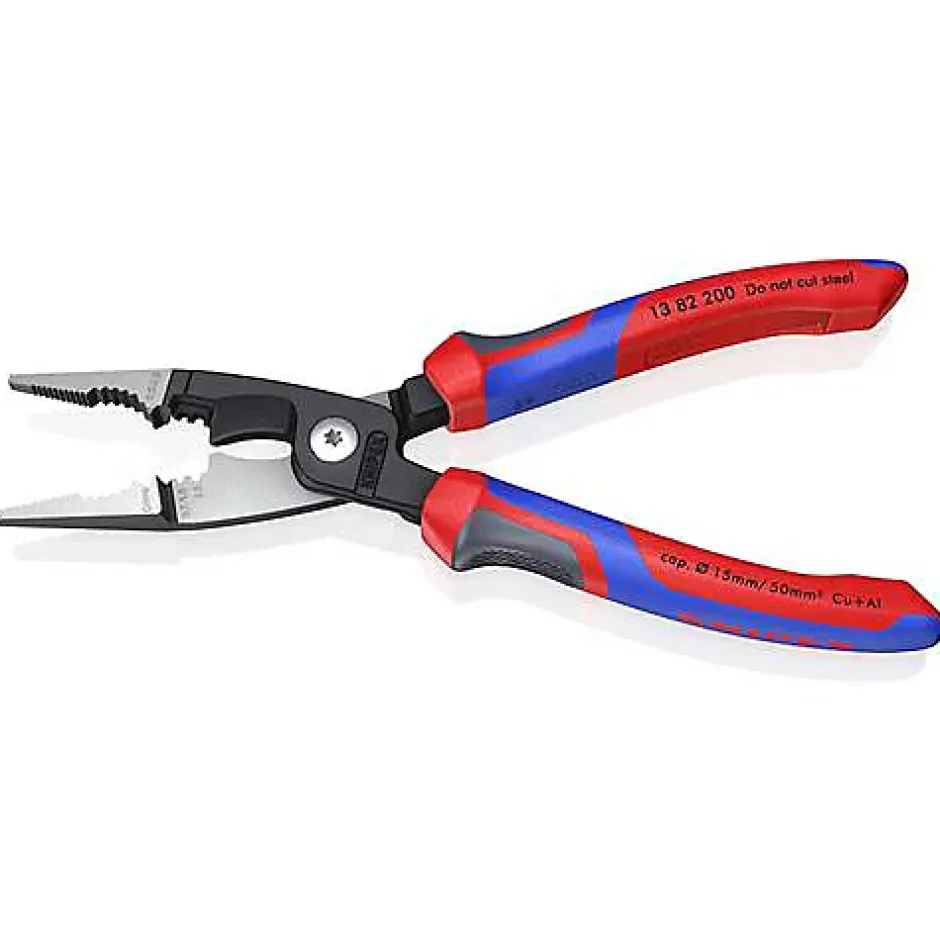 Pince multifonction Knipex 200 mm, robuste et polyvalente, idéale pour les installations électriques — dénudage jusqu’à 50 mm², coupe de câbles jusqu’à 15 mm de diamètre, sertissage et saisie sans abîmer les conducteurs, avec charnière vissée et poignées bi-matière pour confort et précision.