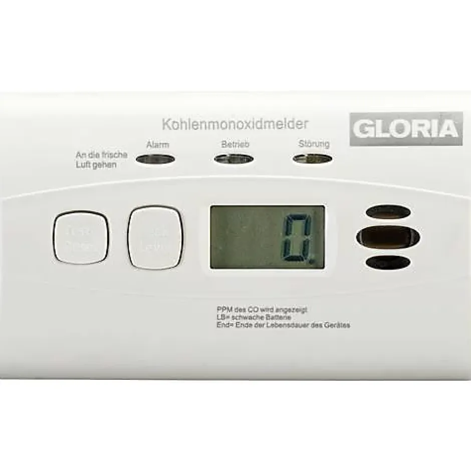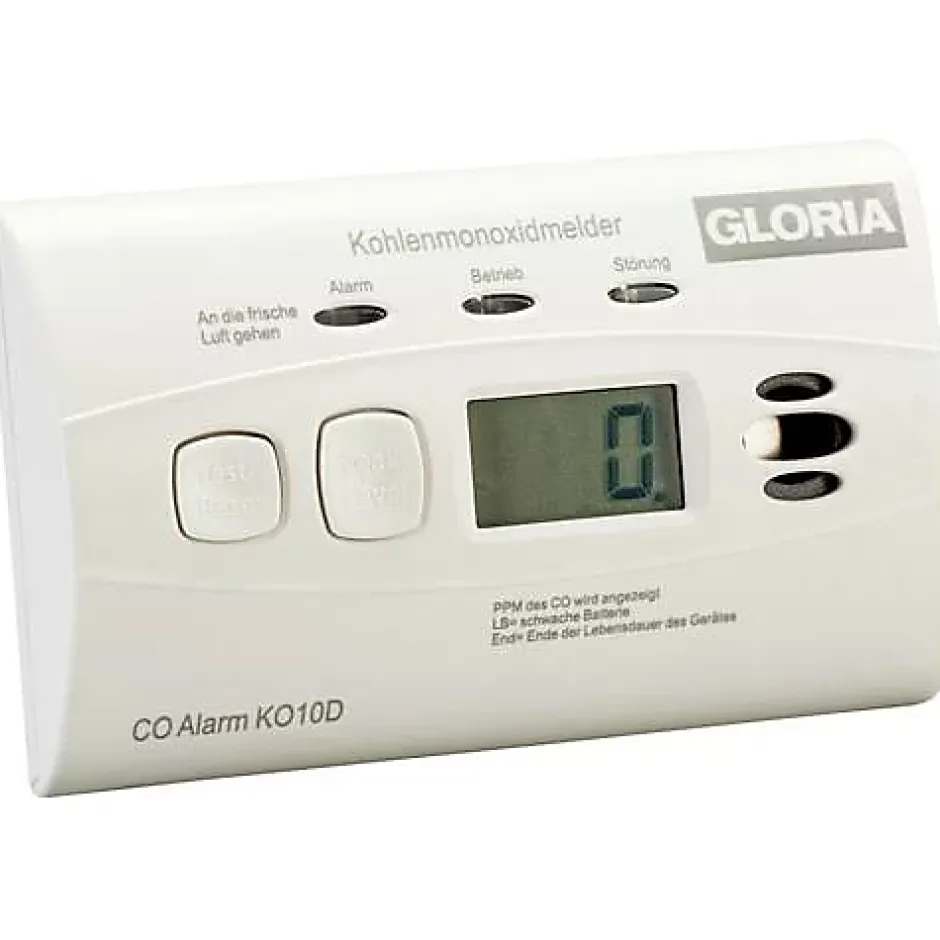 Détecteur de monoxyde de carbone Gloria KO10D, modèle KO10D, conçu pour une sécurité durable en milieu domestique. Alimentation par pile lithium 3 V DC scellée intégrée, durée de vie de 10 ans sans remplacement. Équipé d’un affichage numérique et d’une mémoire d’événements pour consulter les valeurs crête. Deux touches de fonction permettent le test d’alarme et la mise en sourdine temporaire conformément à DIN 14676, la diode électroluminescente rouge signale les auto-tests périodiques. Installation facile grâce à la technologie Click-in et fixation fournie. Conforme à la norme EN50291-1:2018, capteur de monoxyde de carbone, indicateur d’alimentation présent, fonctionnement entre 0 °C et 40 °C, appareil autonome sans connectivité smart, tension d’alimentation 3 V DC.