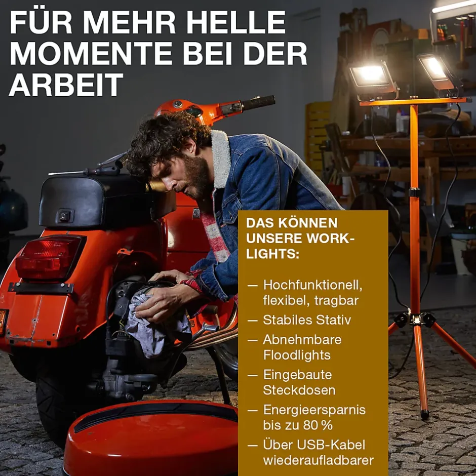 - Conception : Lampe de travail mobile à batterie avec tête d’éclairage pivotante en noir/gris, design compact et construction robuste IP54