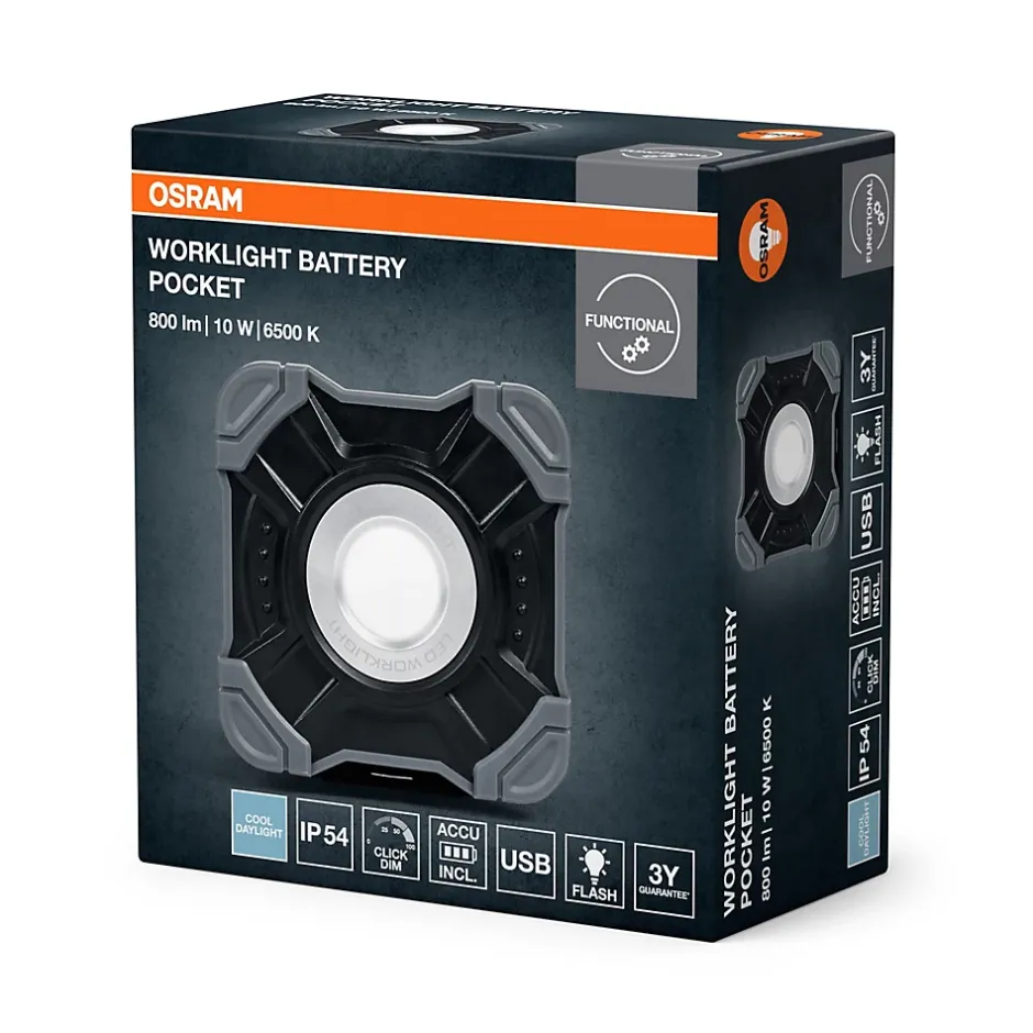 Cette lampe de travail portable OSRAM alimentée par batterie produit une lumière blanc froid de 6500 K avec 800 lumens pour une consommation de 10 W. Sa construction robuste, certifiée IP54, et sa tête d’éclairage pivotante offrent une fonction batterie externe via un port de charge USB. Indépendante du secteur, elle offre un éclairage flexible sur le lieu de travail grâce à sa batterie rechargeable. Idéale pour les rénovations, les ateliers, les garages et les travaux en sous-sol, elle est équipée d’un câble USB-C de 60 cm.