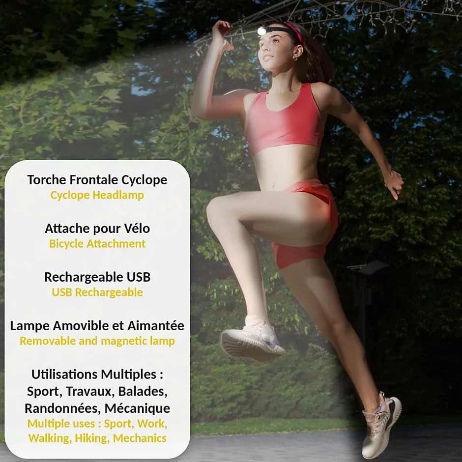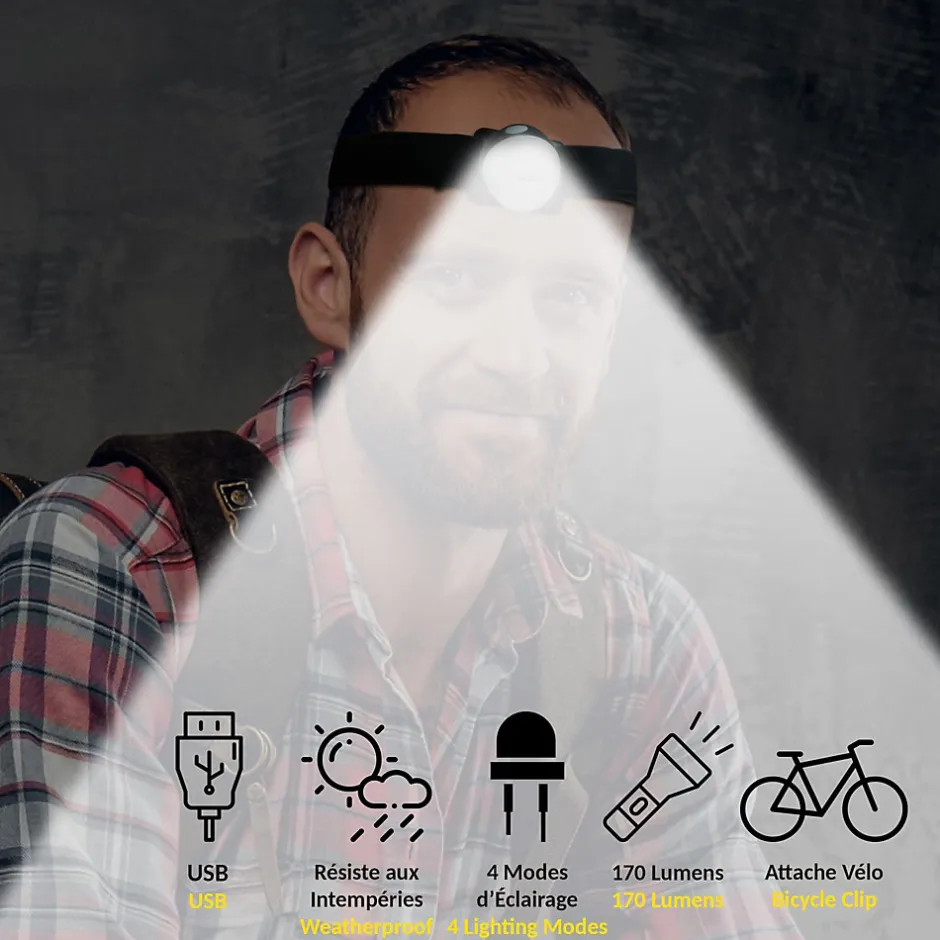 ? ? 2 en 1 ? Cette torche vous permet à la fois d’effectuer de petits travaux dans des endroits sombres grâce à son bandeau frontal réglable, mais vous pourrez aussi l’utiliser pour vos ballades à vélo en tant que feu avant ou arrière avec son attache pour vélo.? ? PUISSANTE ? Composé de 170 lumens, vous bénéficiez d’un éclairage puissant. Maintenue par un aimant puissant, elle se détache et se remet facilement en place, vous pouvez ainsi l’allumer dans votre main et la repositionner ensuite sur votre front. Plus besoin de chercher le bouton on/off à l’aveugle? ? 4 MODES ? La torche dispose de 4 modes : éclairage blanc à 100 %, éclairage blanc à 58 %, rouge fixe et rouge clignotant. Rechargeable par un sable câble USB elle dispose d’une grande autonomie allant de 4 à 8 heures en fonction du mode sélectionné.? ? ORIENTABLE ? Son système aimanté et sa forme de globe permet d’orienter la torche dans tous les recoins de son orbite de façon facile et rapide. De plus, vous ne serez pas dérangé par son poids léger de seulement 60g.? ? CARACTÉRISTIQUES ? Matière : ABS et sangle ajustable en polyester ? Alimentation : batterie lithium 500 mAh incluse / câble USB inclus (adaptateur secteur/USB non inclus) ? Poids : g ? Portée : environ 30m ? Puissance : 170 lm (100%) ; 100 lm (58%) ; 3 Watt ? Temps de charge : 1,5h environ ? Autonomie 8h (58%) / 4h (100%) ? Certifiée CE, RoHS ? Garantie 2