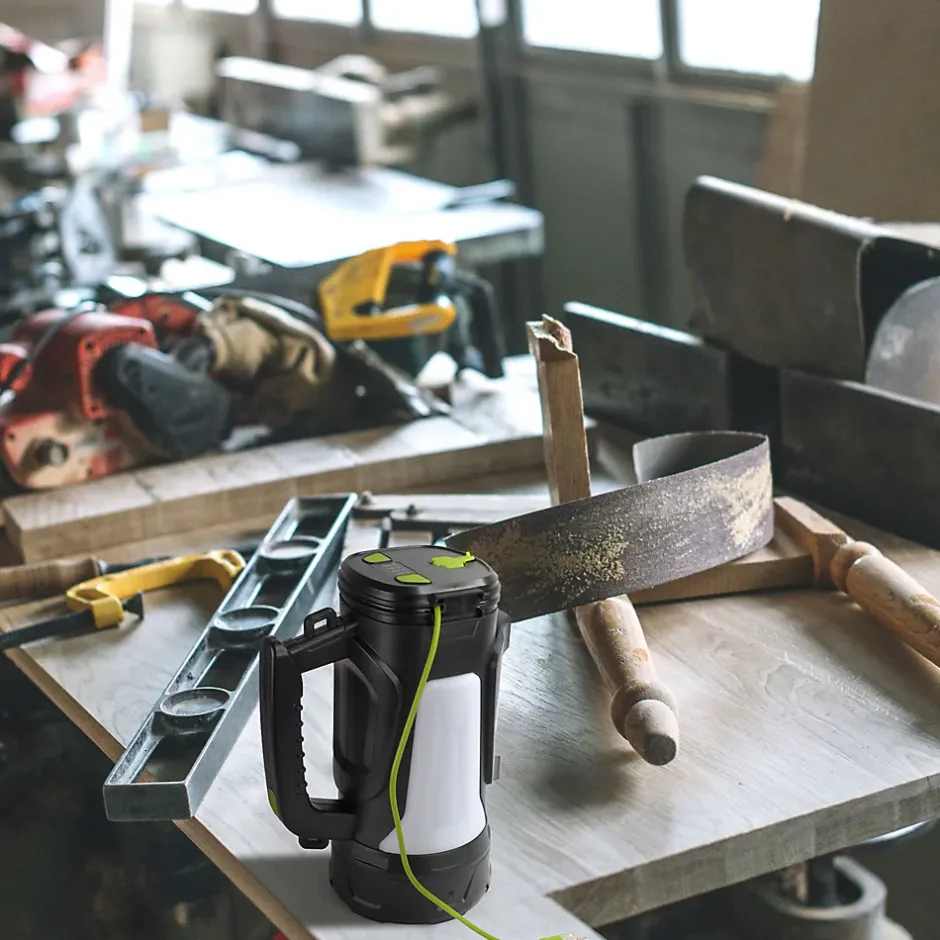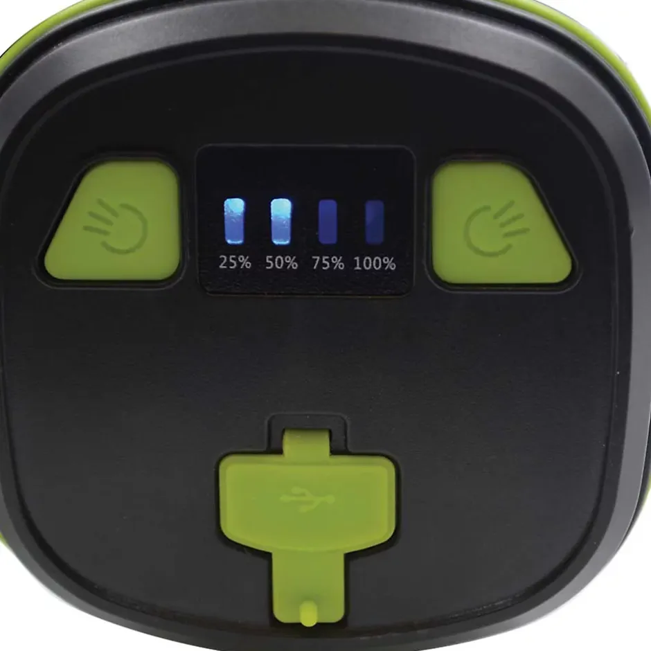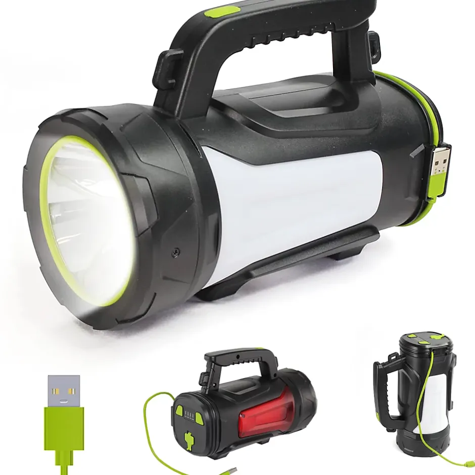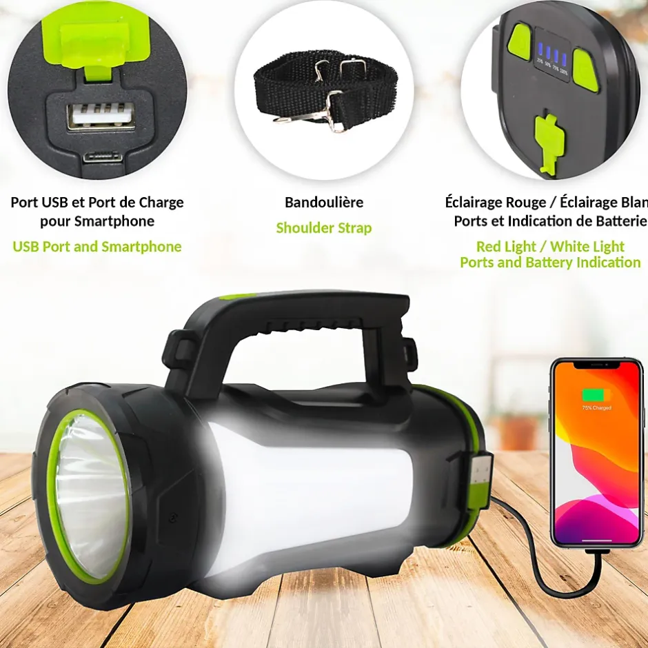 ULTRA PUISSANTE – La torche principale équipée d’une LED OSRAM de 1000 lumens offre un faisceaux lumineux avec 3 modes d’éclairage ( 100% – 50% clignotant) avec une portée de 1000 m. Sur un des côtés vous disposez d’une lumière blanche avec 2 choix d’intensité (100% – 50 %) permettant d’éclairer efficacement votre zone de travail. Sur l’autre côté une lumière rouge fixe ou clignotante permet de vous signaler la nuit.RECHARGEABLE – La torche rechargeable dispose d’un câble de rechargement USB intégré qui se range directement autour de la torche. Plus de risque de le perdre ou l’oublier. Enfin, un témoin de charge vous indique le pourcentage de batterie restant.BATTERIE EXTERNE – La Lampe Torche LED dispose d’un port USB et un port micro USB permettant de l’utiliser comme batterie externe ou power Bank afin de recharger votre smartphone portable ou tablette pratique quand vous manquez de batterie pour vous ambiance par exemple dans votre camping préféré.PORTABLE – La poignée ergonomique et la bandoulière permettent de l’utiliser et de l’emmener partout avec vous. Son format compact et léger permet le transport facilement. Vous ne partirez plus sans votre lampe torche ultra puissante en vacances.CARACTERISTIQUES – Matières : ABS – Alimentation : Batterie Lithium 18650 rechargeable 5W – Câble de chargement intégré (26 cm) – Torche 1000 Lumens – Led OSRAM – Portée 1000m – Lumière blanche – COB – 2 modes (100% – 50%) – Lumière rouge – COB – 2 modes (100% / clignotant)