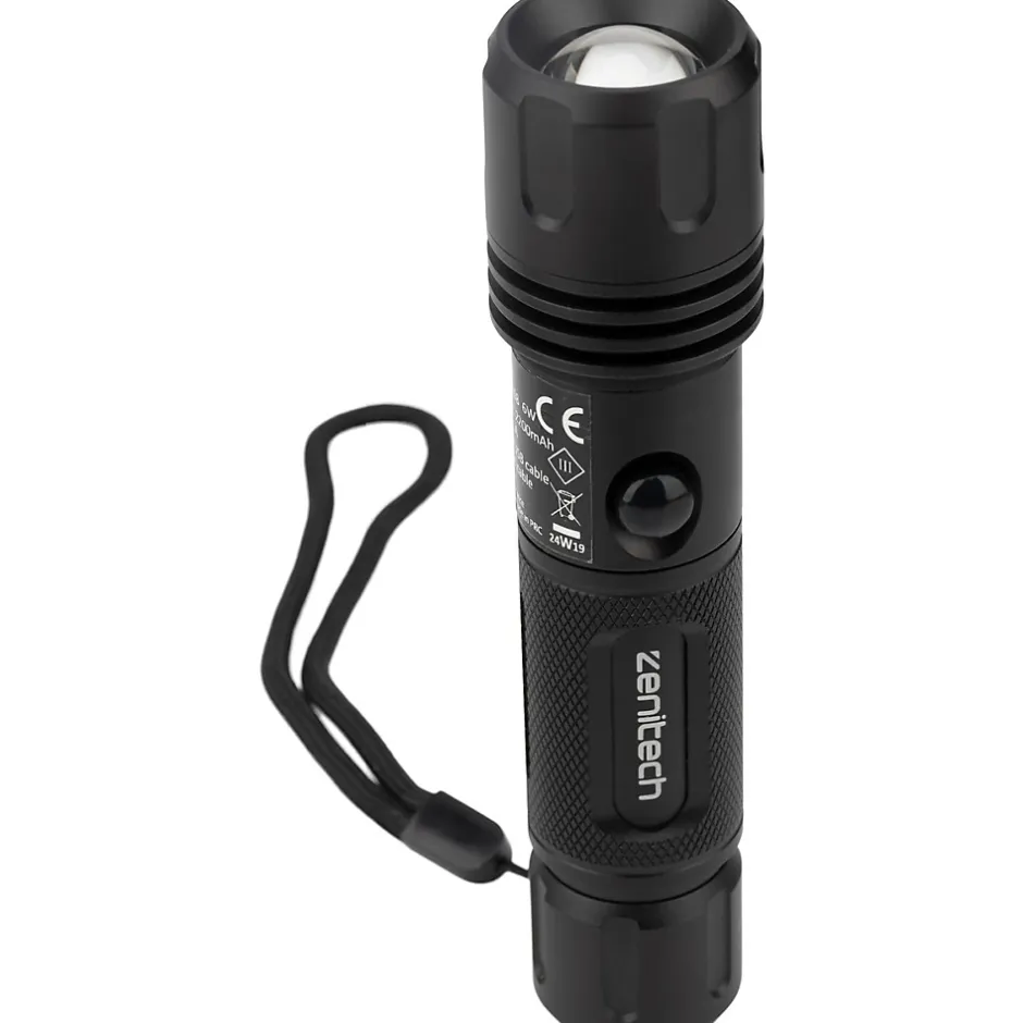 Lampe torche rechargeable LED. Couleur(s) : noir. Intensité lumineuse : 160/500lm. Autonomie : entre 5 et 7h. Portée 50m (haute intensité), 25m (basse intensité). 2 modes d’éclairages : une fonction zoom + flash clignotant. Matériau : aluminium. Avec dragonne. Temps de charge : 5h. Batterie Li-Ion 3.7V 2200 mah. Chargement par câble USB (type A). Longueur du câble : 0.5m
