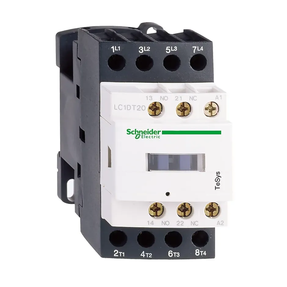 Contacteur de puissance 4P – 25A – 4NO – Schneider LC1DT25P7Ce contacteur de puissance tétrapolaire fabriqué par Schneider Electric (anciennement Télémécanique) est issu de la gamme TeSys LC1DT .De calibre 25A, les contacts 4NO (contacts normalement ouverts) sont actionnés par une bobine de tension 230Vca . Le circuit de commande 4NO est complété par des contacts auxiliaires 1NO + 1NF.Ce contacteur LC1DT dispose d’un système de connexion à vis étrier.Appareillages compatibles avec le contacteur Schneider LC1DT25P7