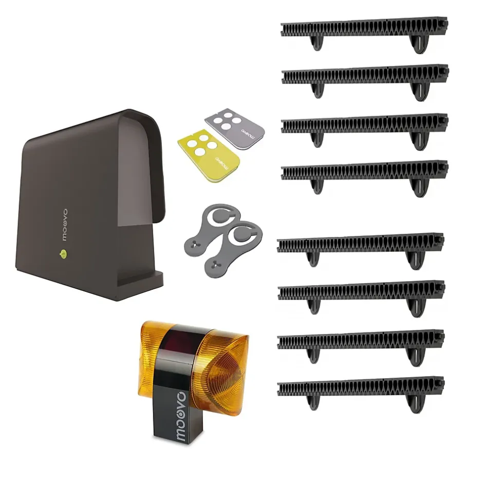 Kit complet MOOVO LN432KM pour motorisation de portail coulissant : solution prête à installer, sûre et pratique, adaptée aux portails jusqu’à 5 m de largeur et 300 kg par vantail, avec commandes, sécurité et signalisation incluses.