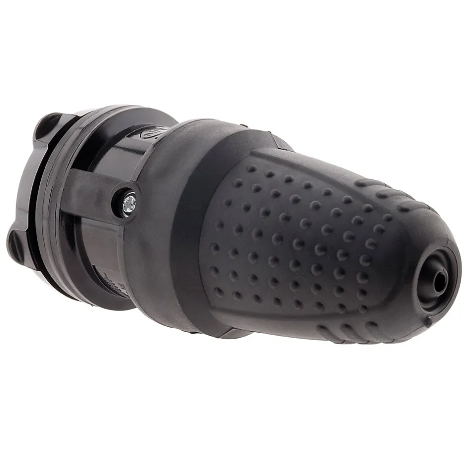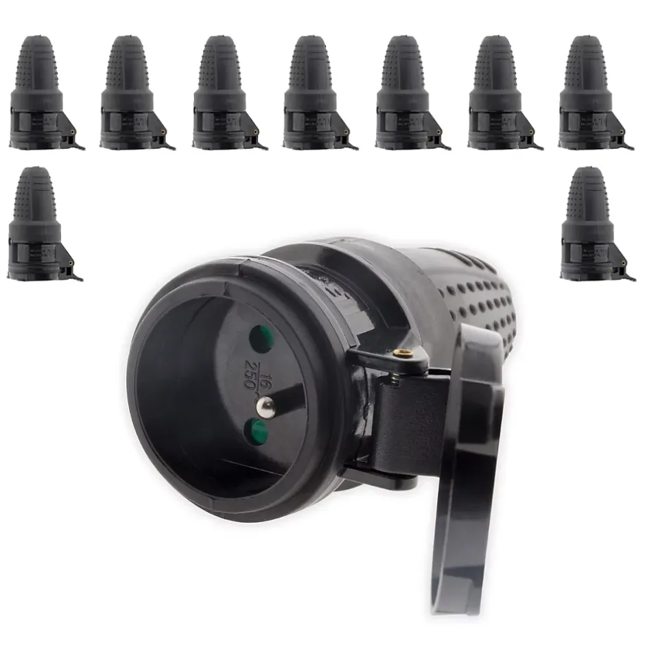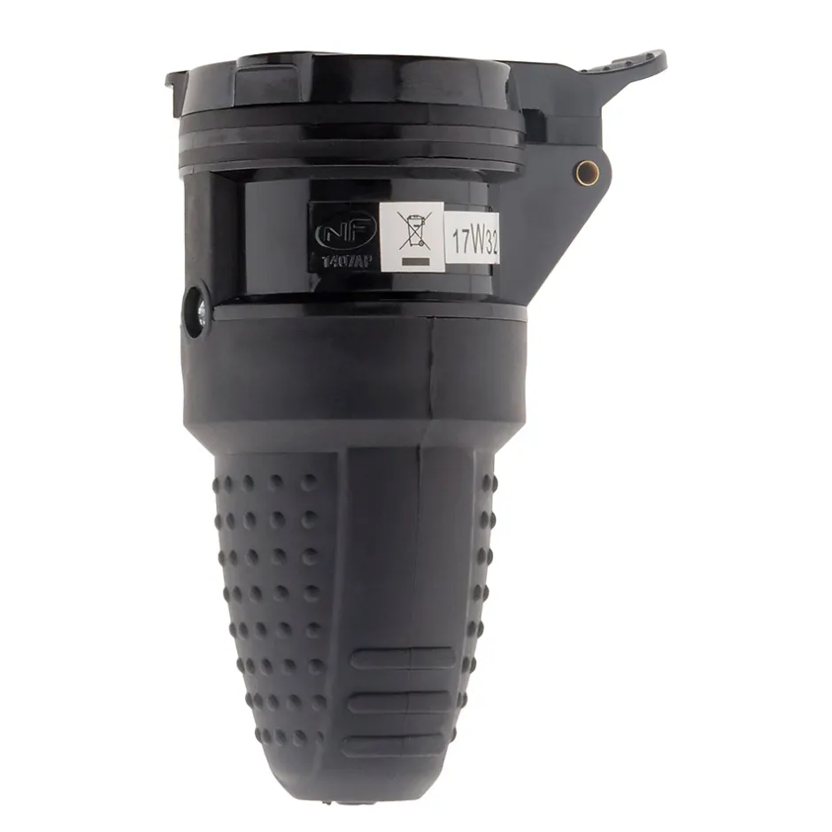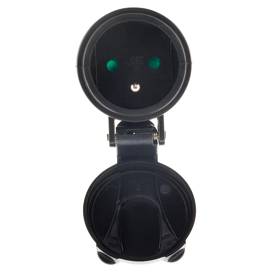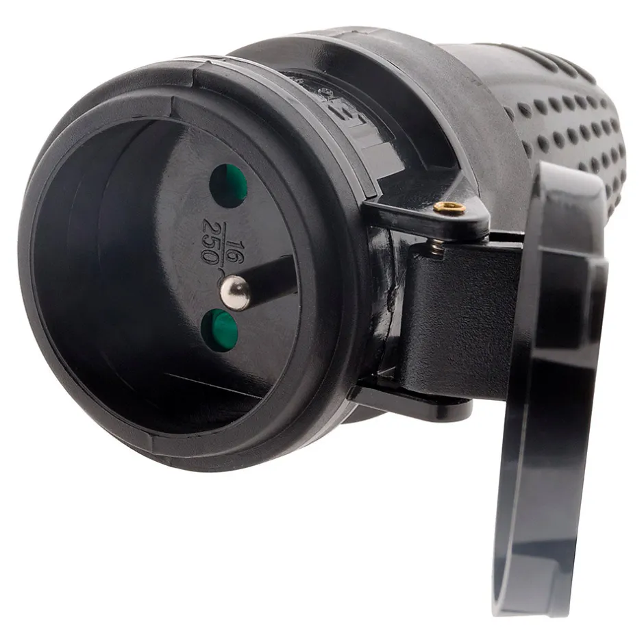 Fiche électrique femelle 2P+T 16A. Couleur(s) : noir. Matériau : caoutchouc étanche, haute résistance. Protection : IP44 (protégée contre projections d’eau et poussières). Tension nominale : 230V. Intensité : 16A. Puissance maximale : 3680W. Certification : NF