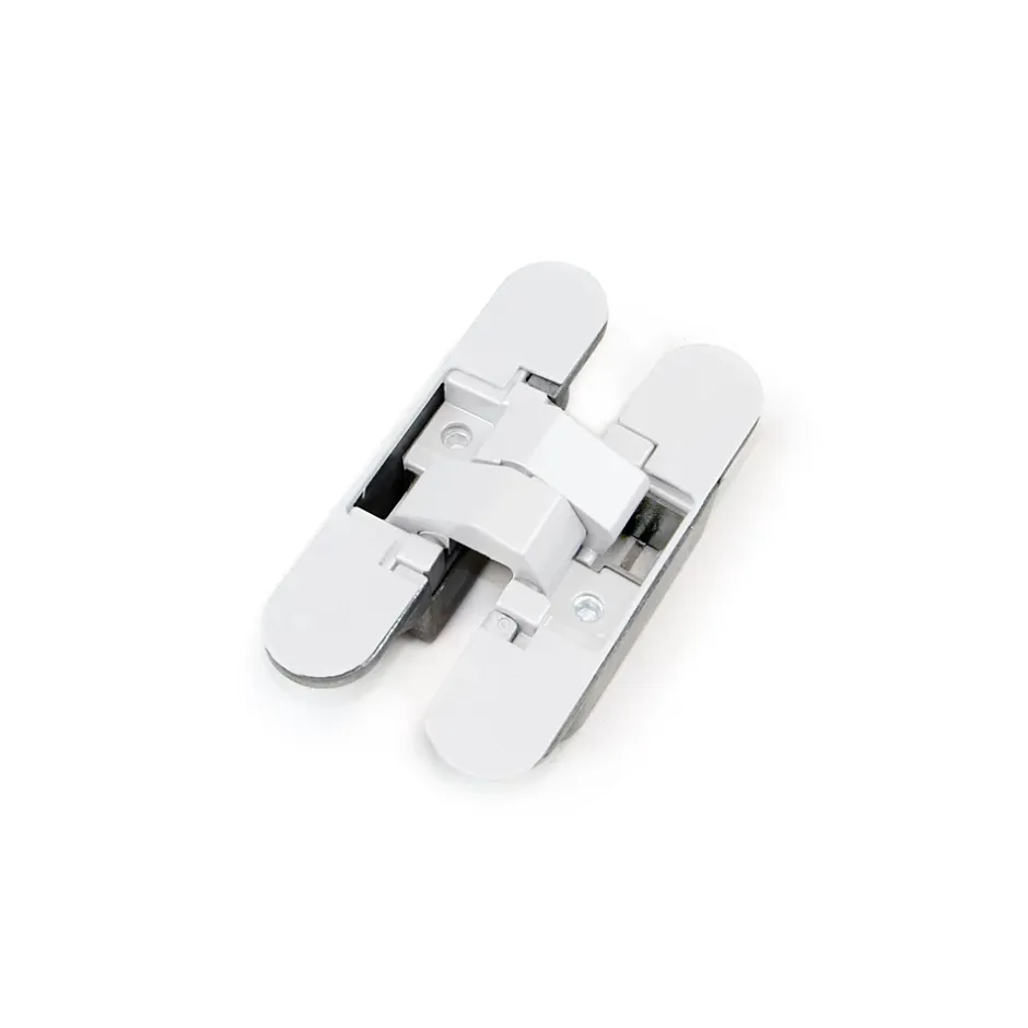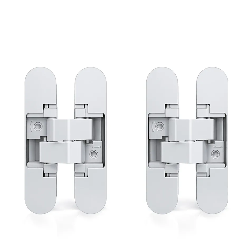 Lot de 2 charnières invisibles pour portes d’une épaisseur minimale de 28 mm.Capacité de charge de 40 kg et angle d’ouverture de 0º à 180º.Ajustement tridimensionnel : ±2,5 mm de hauteur, ±1 mm de profondeur et ±1,5 mm de réglage latéral.Testées contre les incendies.Fabriquées en zamak avec couvercles en plastique d’embellissement inclus de couleur blanc. VOIR LES MESURES DU PRODUIT DANS LES IMAGES. Charnières invisibles avec un système fonctionnel entièrement occulté. Idéal pour une installation sur des portes d’habitation qui ne se chevauchent pas. Ces charnières dissimulées ont une capacité de charge de 40,60 ou 80 kg et angle d’ouverture de 0º à 180º. Elles peuvent être installées sur des portes lourdes d’une épaisseur minimale de 28 mm et ajustées facilement de manière tridimensionnelle: ±2,5 mm de hauteur, ±1 mm de profondeur et ±1,5 mm de réglage latéral.Fabriquées en zamak avec finition grise métallisée et couvercles d’embellissement en plastique gris, blanc ou noir. Fournies en lots de 2 unités sans vis de montage.