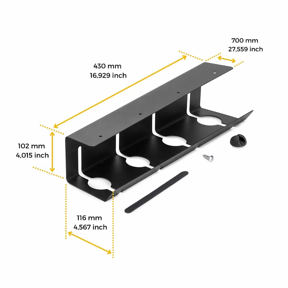 Lot de 2 chemin de câbles pour une installation sous le bureau. Idéal pour les bureaux, les bureaux d’étude, les centres de loisirs et pour éviter que les câbles ne s’emmêlent.Chaque plateau mesure 430 mm de long, 102 mm de haut et 116 mm de profondeur et peut supporter jusqu’à 5 kg.Il est livré avec les vis nécessaires pour fixer le plateau à n’importe quel endroit sous le bureau. Les plateaux peuvent accueillir divers câbles, adaptateurs et multiprises.U comprend un ensemble de bandes Velcro et de serre-câbles adhésifs pour éviter que les câbles ne glissent ou ne s’emmêlent.Fabriqué en acier peint en noir. VOIR LES MESURES DU PRODUIT DANS LES IMAGES. Les chemin de câbles sous le bureau sont conçus pour garder vos câbles bien rangés et sans enchevêtrement, ce qui en fait une solution pratique et esthétique pour garder votre espace de travail exempt de câbles. Ils sont idéaux pour les bureaux, les tables de travail ou les espaces de divertissement, car ils sont faciles à installer et s’adaptent à différents types de tables.Ces chemin de câbles sont fabriqués en Acier, ce qui les rend robustes et permet d’y placer divers câbles, adaptateurs et prises. De plus, ils sont dotés de bandes Velcro qui assurent le soutien et l’organisation, évitant ainsi que les câbles ne glissent ou ne s’emmêlent.Le chemin de câbles comprend les vis nécessaires à l’installation et de petits organisateurs de câbles adhésifs. En bref, cette solution tout-en-un vous permet de ranger vos câbles et d’organiser efficacement votre environnement de travail.